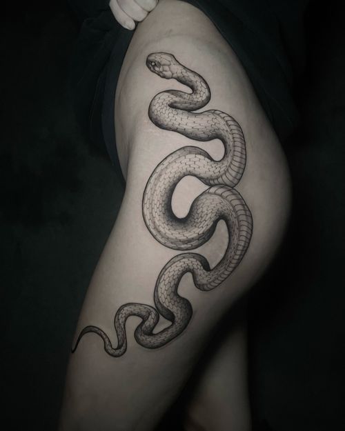Snake tattoo meant to be created for this placement. Sharp and bold- magnificent result by our resident @o.s.c.r.tttst