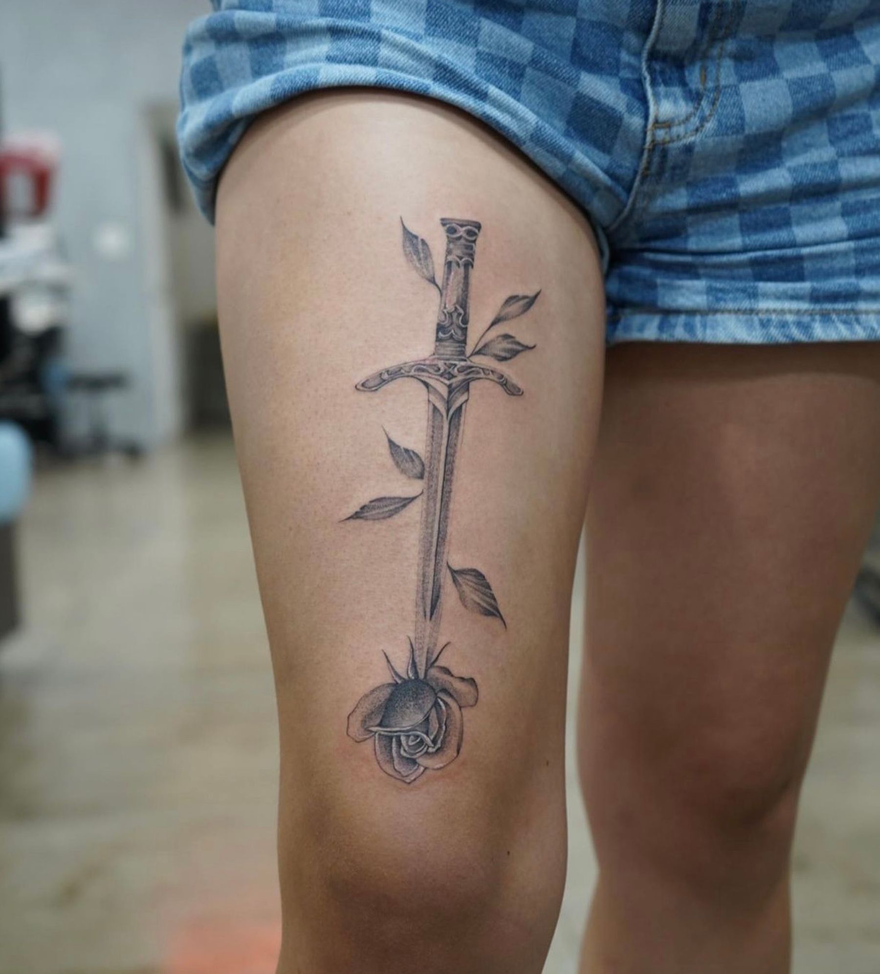 The tattoo is a traditional depiction of a sword intertwined with a rose and leafy elements. The style is classic with fine shading and linework. The overall design has an elegant and symbolic feel.