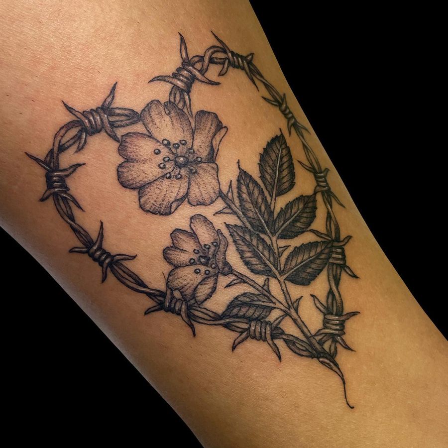 Barbed Wire Heart and Flowers Tattoo