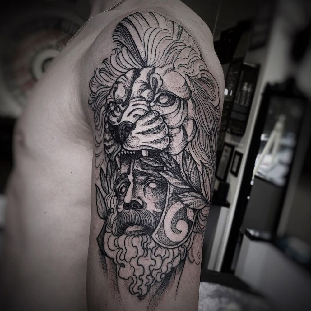 Capture the intensity of lion and man with intricate dotwork and black & gray shading by Lamat. Perfect for upper arm placement.