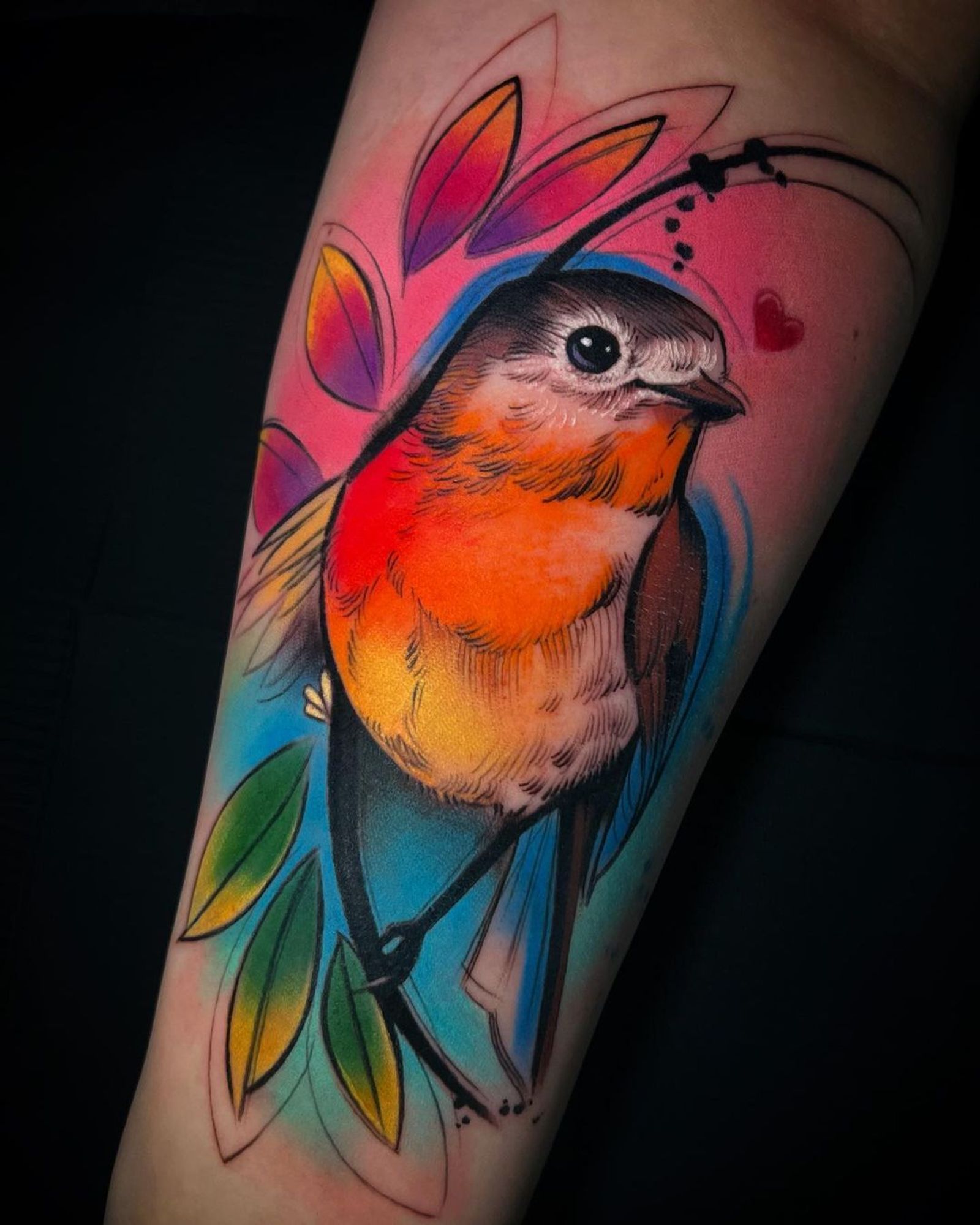 Express your love for nature with a captivating watercolor forearm tattoo by Cloto.tattoos. Features a bird, heart, and leaf motif.