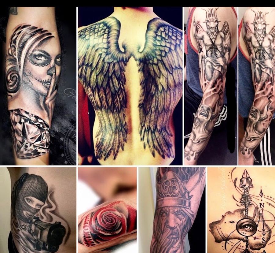 Tattoos done by myself, Artist Bella, at Platinum Tattoo Kelowna, Canada. Including a full mens backpiece wing tattoo, Viking sleeve tattoo, gangster girl rib tattoo, baseball rose tattoo and day of the dead girl sleeve tattoo.