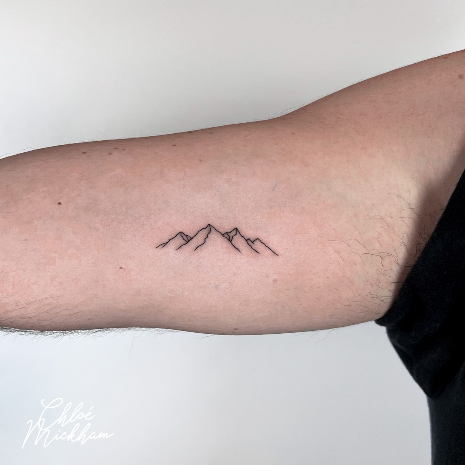 Get mesmerized by the dainty beauty of this fine line mountain tattoo, skillfully done by Chloe Mickham.