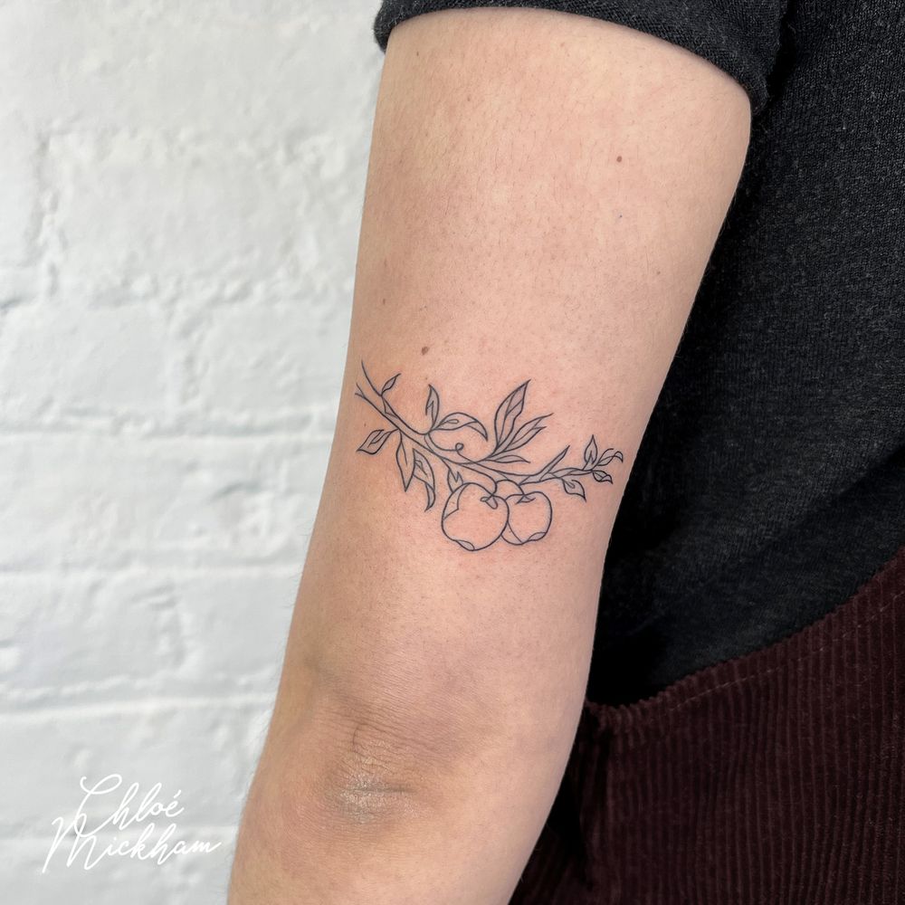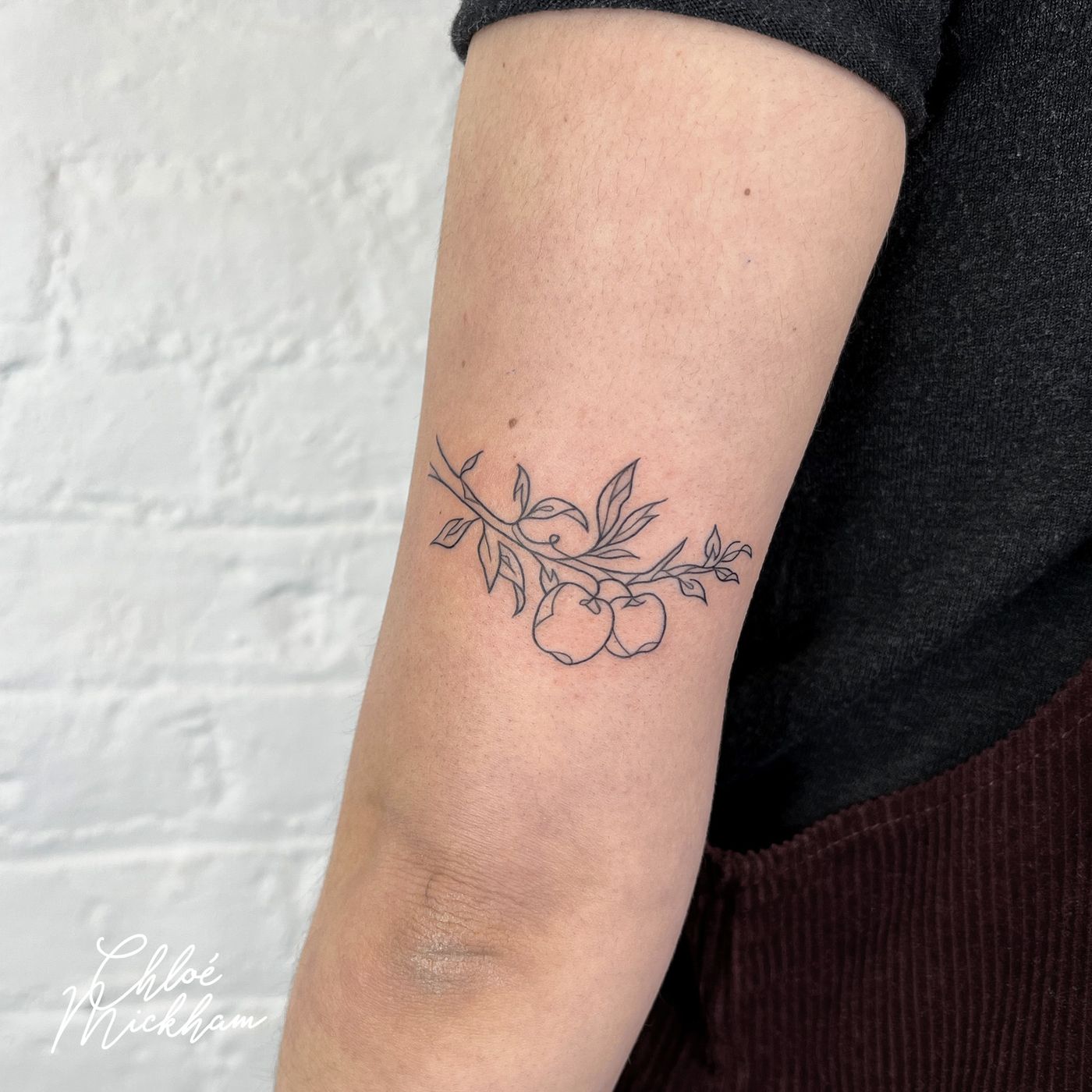 Get a stunning illustrative apple tattoo with fine line details by the talented artist Chloe Mickham. This single line fruit design is a unique and elegant choice for your next tattoo.