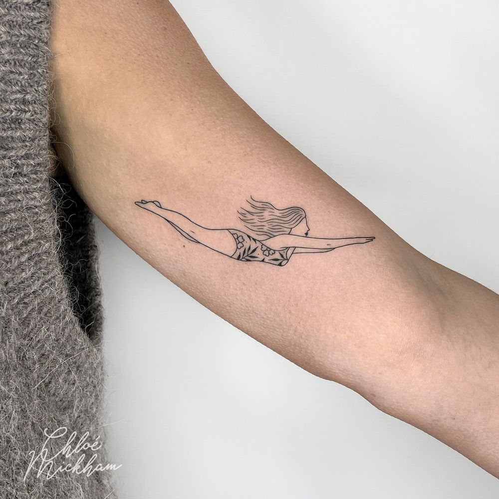 Get a stunning fine line tattoo of a graceful swimmer by Chloe Mickham. Perfect for those who love elegant and detailed designs.