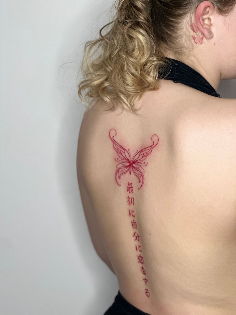 • Butterfly • Delicate spine project in red ink by our resident @cat_vaska116 Books/info in our Bio: @southgatetattoo • • • #redinktattoo #spinetattoo #redtattoo #redink #butterflytattoo #sgtattoo #londontattoostudio #southgatetattoo #southgatepiercing