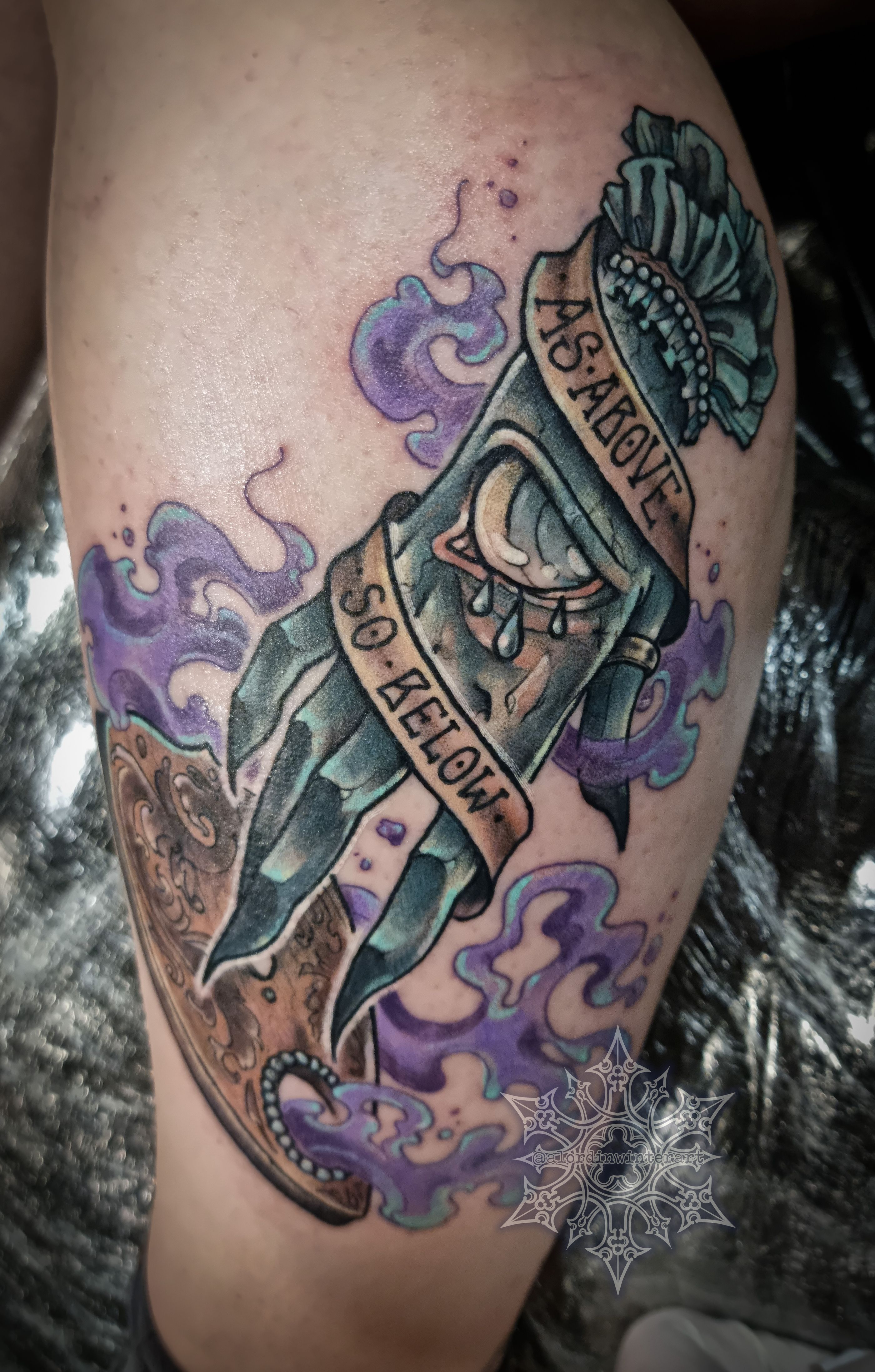 Ouija planchette tattoo with spooky hand in #neotrad by Dunkan Nober @alordinwinterart Nober.dunkan1888@yahoo.com #neotraditional #gothistattoo #illustrativetattoo #halloween #ouijatattoo #eyetattoo #handtattoo #alordinwinterart