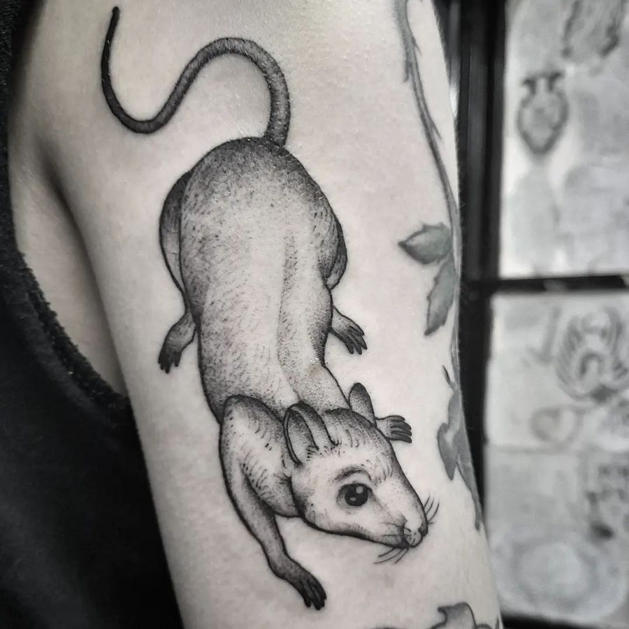 Upper arm tattoo featuring a realistic black and gray rat design by renowned artist Elisa Thirteen. Visit us to get yours today!