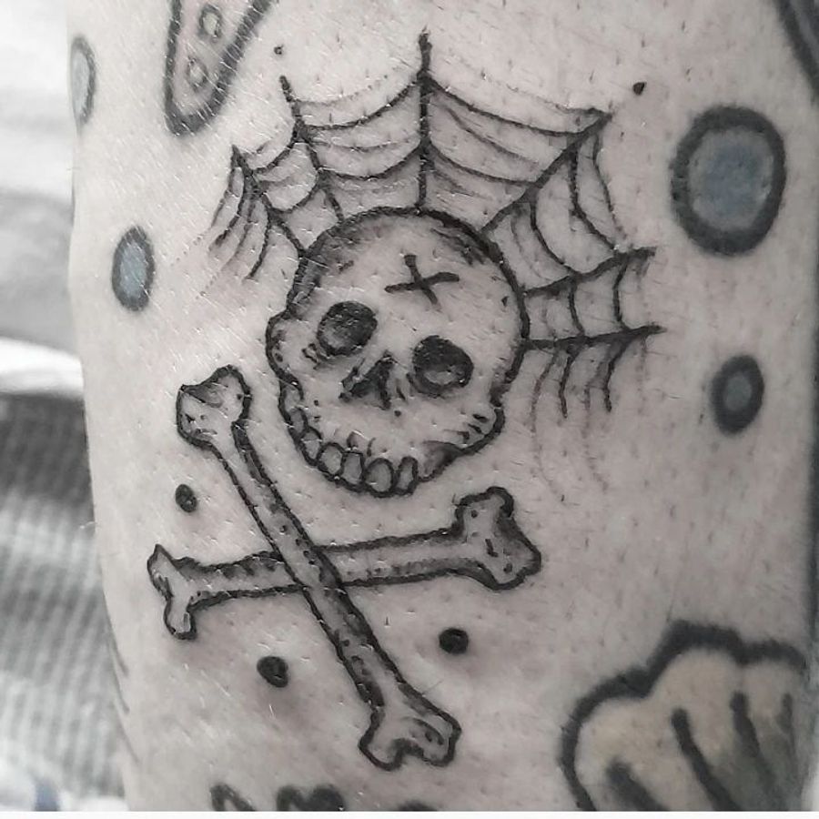 Get inked with this haunting black and gray tattoo featuring a skull and spiderweb design by Elisa Thirteen.
