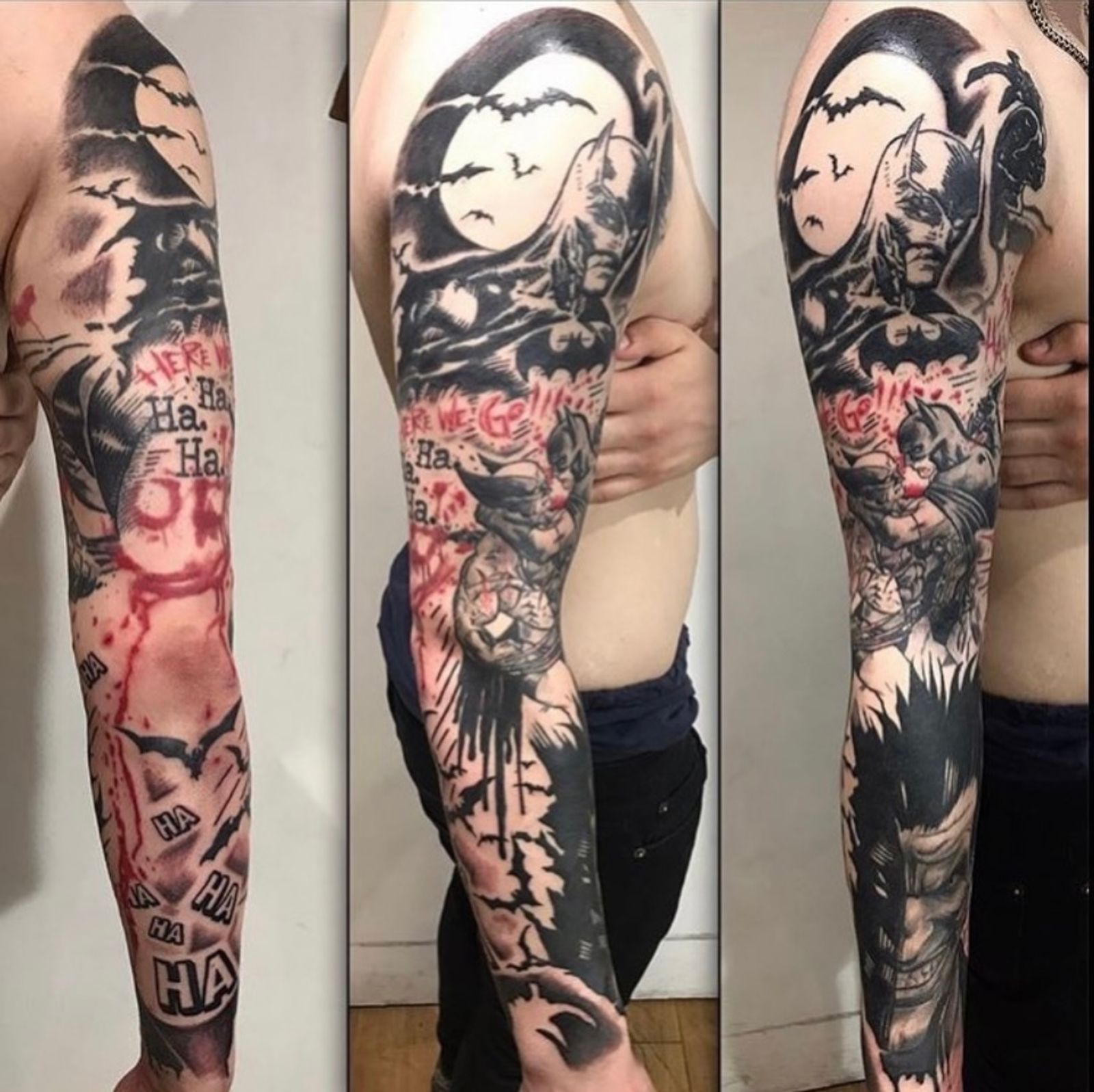 Photos of the completed dark superhero sleeve...... ๐Ÿ‘Š๐Ÿฝ #superherosleeve #wolverine #dccomic #marvelcomic #bkackandredsleeve #darkcomic #darkcomicsleeve #bloodsplatter #comicsleeve #joker #customtattoo #customdesign #inked #inklife #r #londonink #londo tattoo artist #dccomictattoo #marveltattoo #comictattoo #batmantattoo #wolverinetattoo #superherotattoo #batman