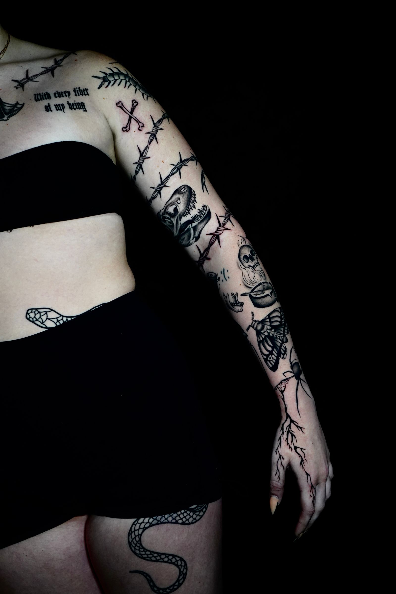 This is a sleeve tattoo that incorporates various dark and macabre elements. It features script, barbed wire, a dog's head, a skull with smoke, a butterfly, a snake, and a branch. It is done in a blackwork style with a mix of fine lines and bold shading to convey a gloomy feel.