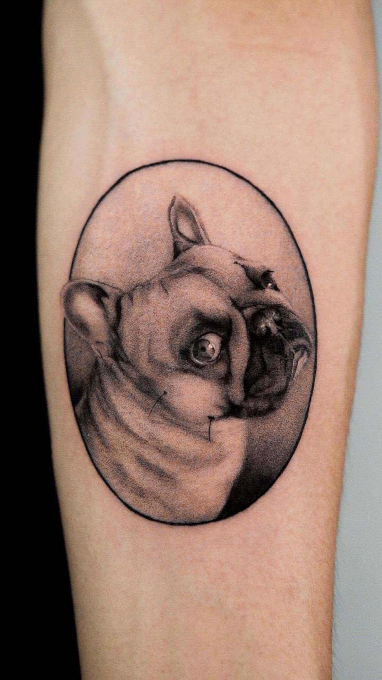 Admire Jacky Yang's micro_realism masterpiece on lower arm featuring a detailed French Bulldog in a delicate dotwork frame.
