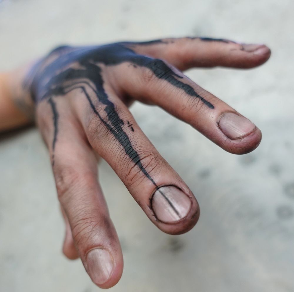 Get inked by Rachel Aspe at Bellatrix Tattoo with a unique abstract design on your hand in bold blackwork style.