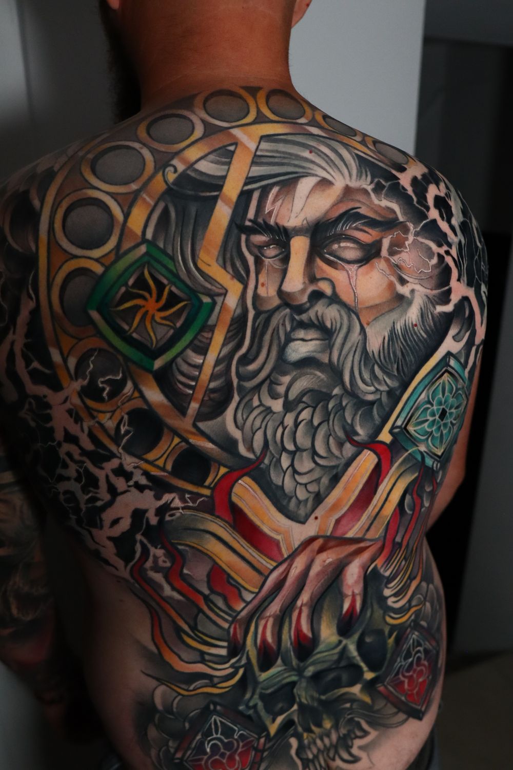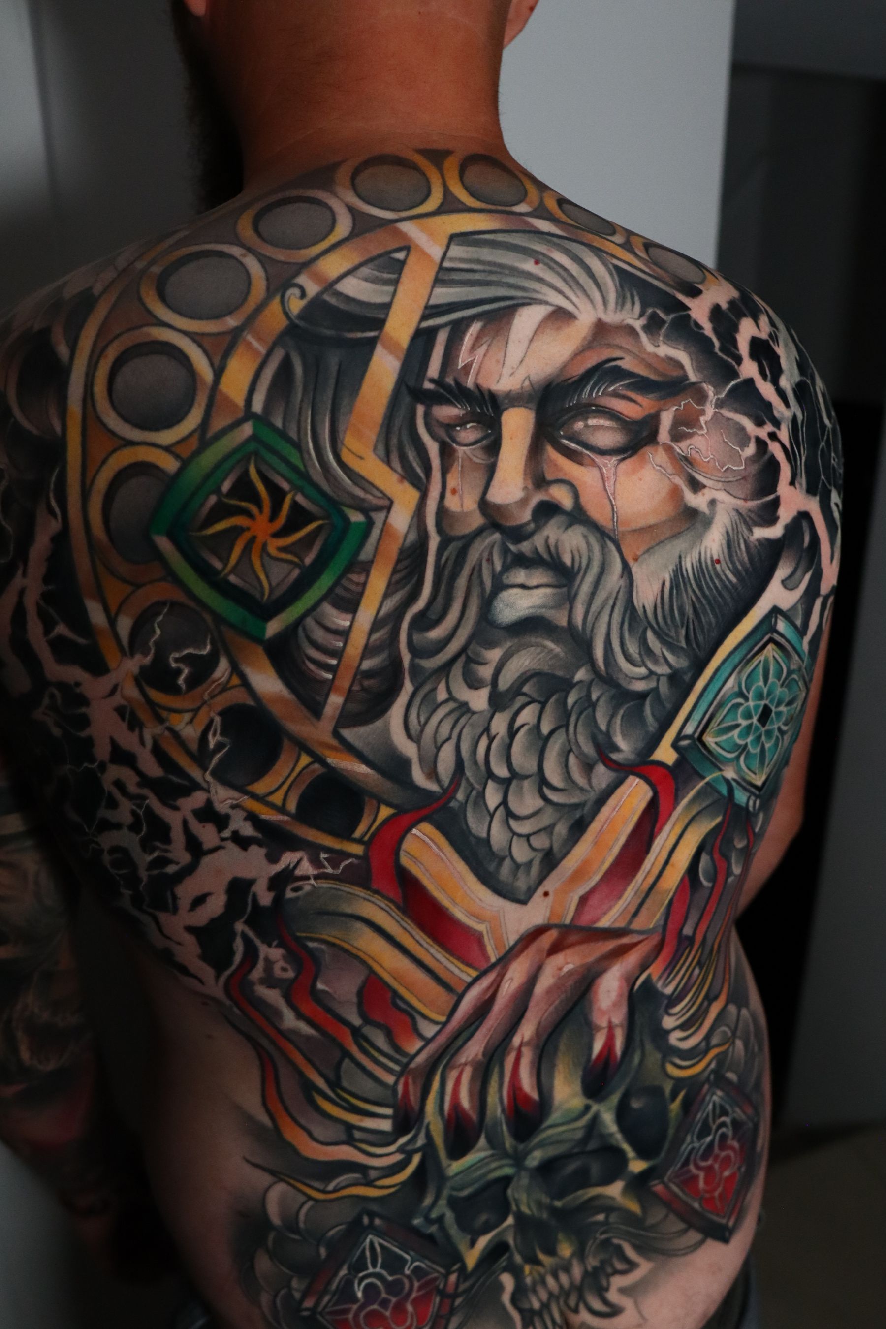 #zeustattoo #godtattoo #greekgodtattoo #colourtattoo #neotrad #neotraditionaltattoo #tattoo #tattoos #london #londontattoo #greektattoo #backtattoo #beautifultattoos #fullbacktattoo #epictattoo