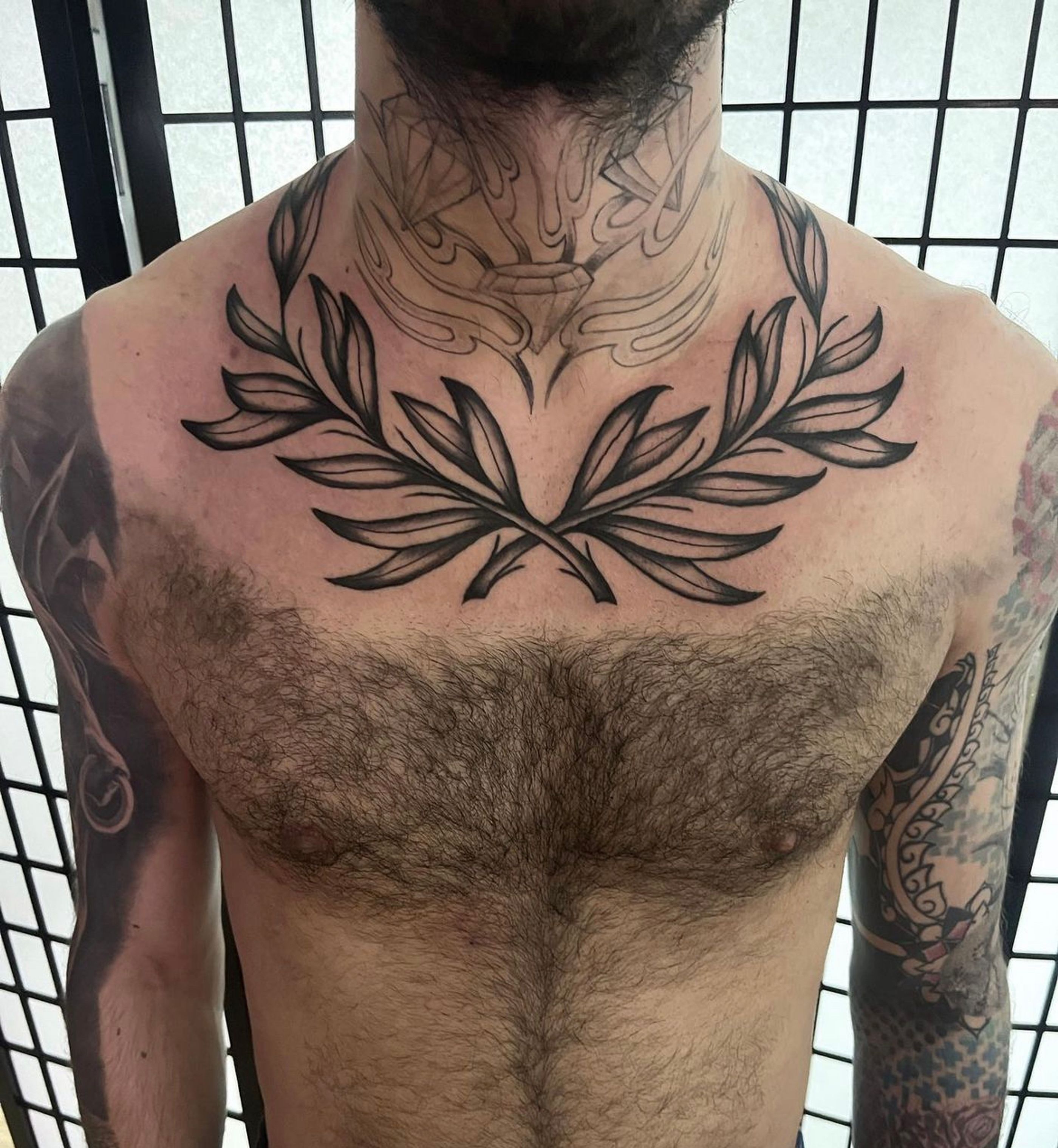 This is a symmetrical tattoo design with a wreath of leaves. The leaves are detailed with shaded areas, giving a sense of depth and volume. The overall design feels classic, elegant, and decorative.