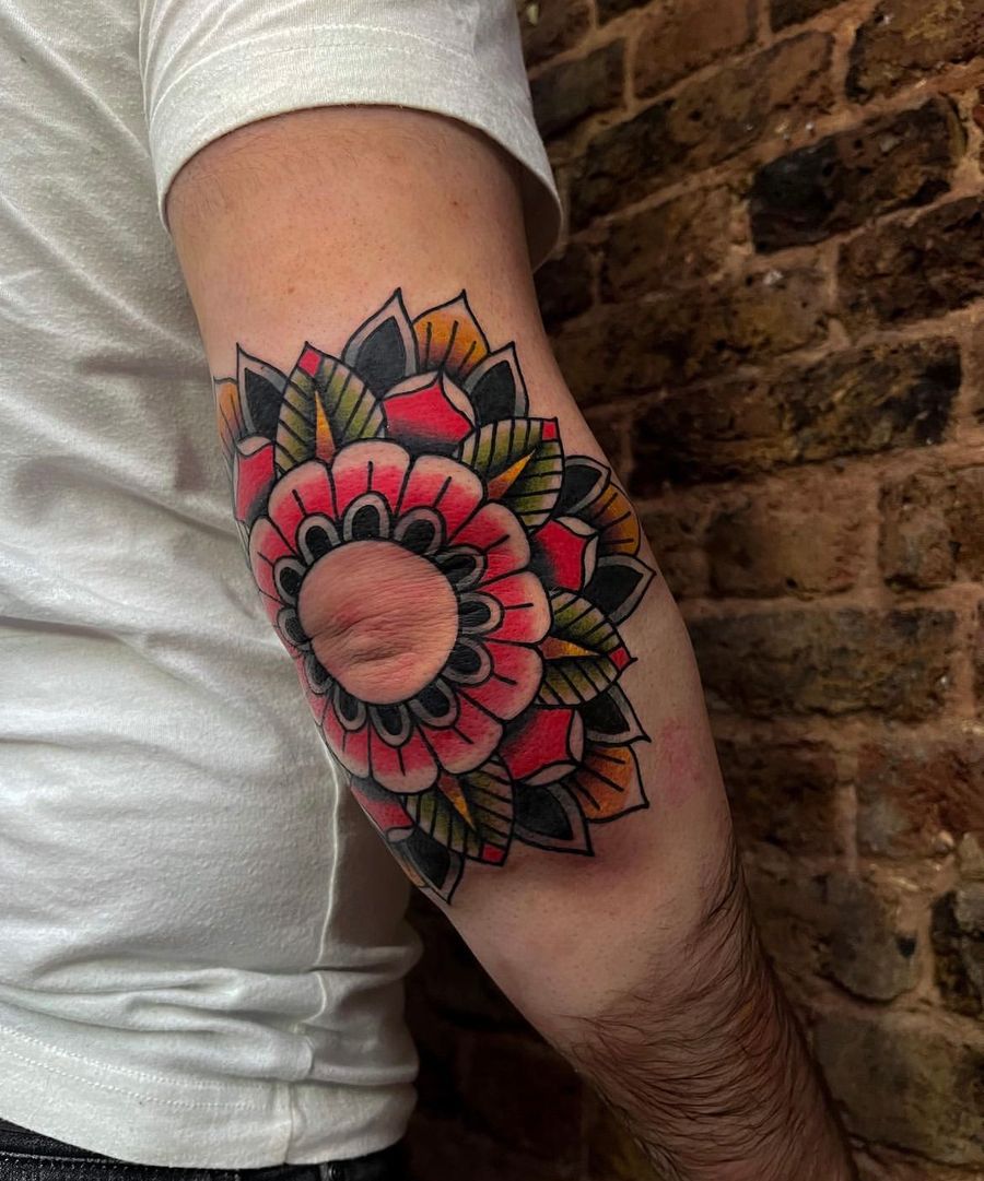 The tattoo features a colorful floral design on the elbow. The bold lines and use of colors give it a classic traditional tattoo feel.