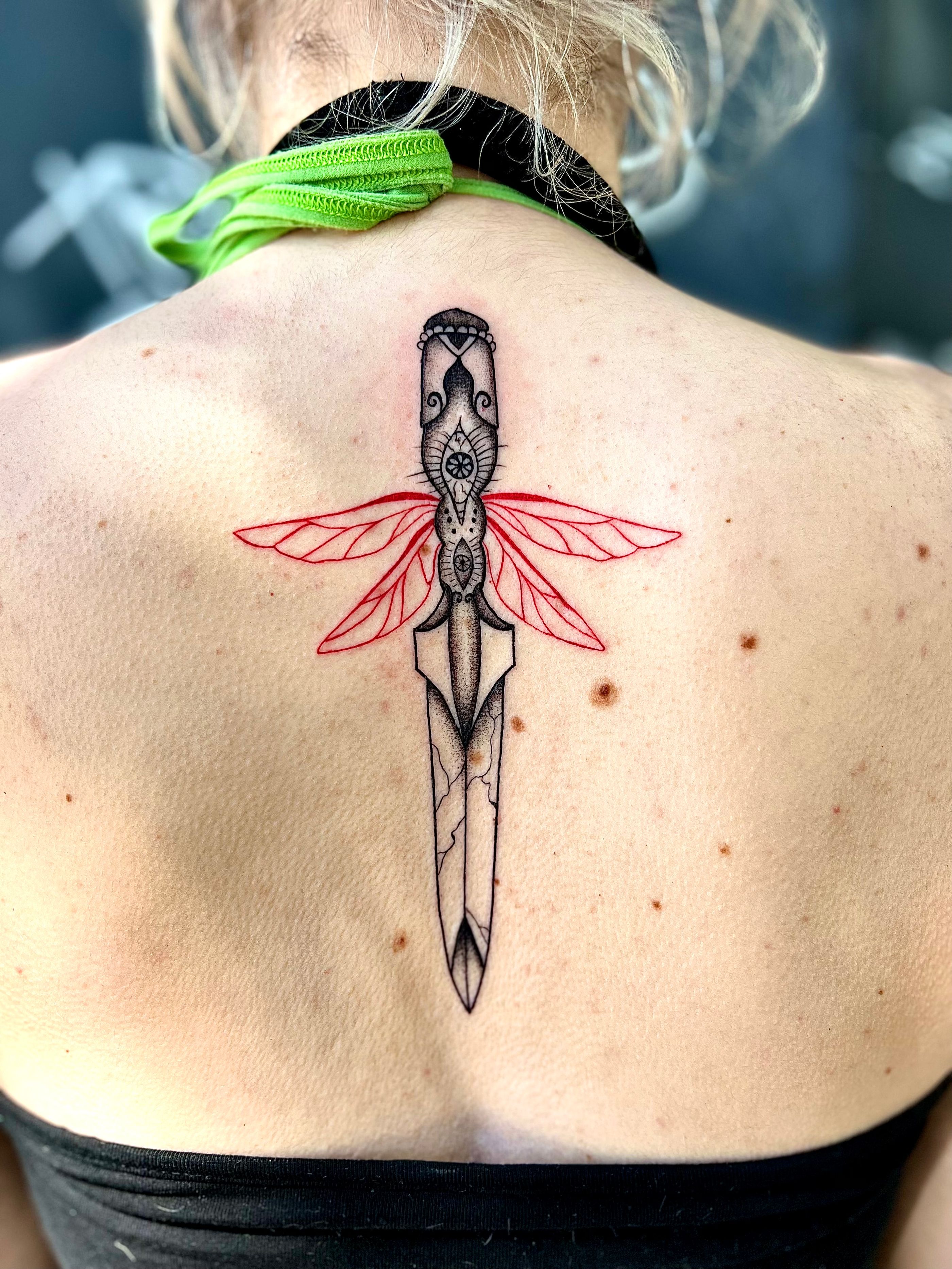 Discover the intricate beauty of dotwork and fine line in this illustrative piece by Claudia Whiteheart. The dagger symbolizes bravery and protection, while the wings represent freedom and spirituality.