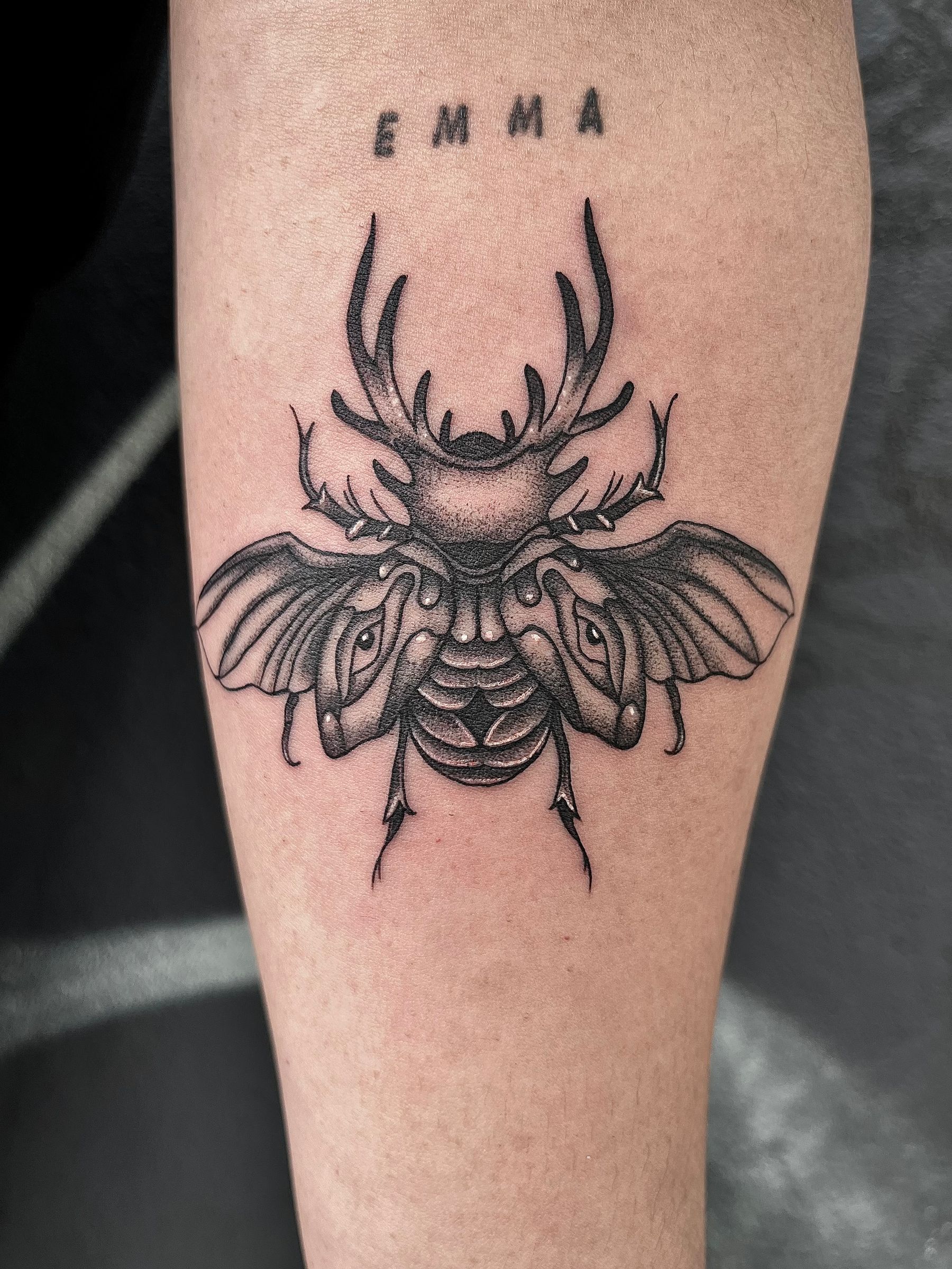 Unique dotwork tattoo of an atlas beetle by the talented artist Claudia Whiteheart. Detailed and stunning design.