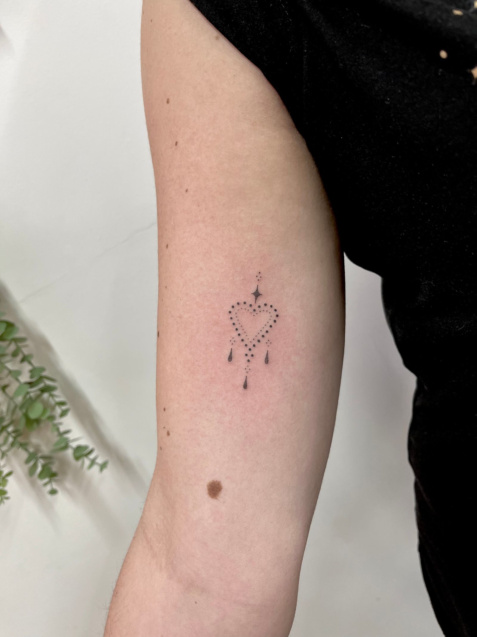 The tattoo is a small heart shape with a dot-work design, dangling from a star above. It's a simple design done with fine line and dot work, creating a delicate and minimalist aesthetic.