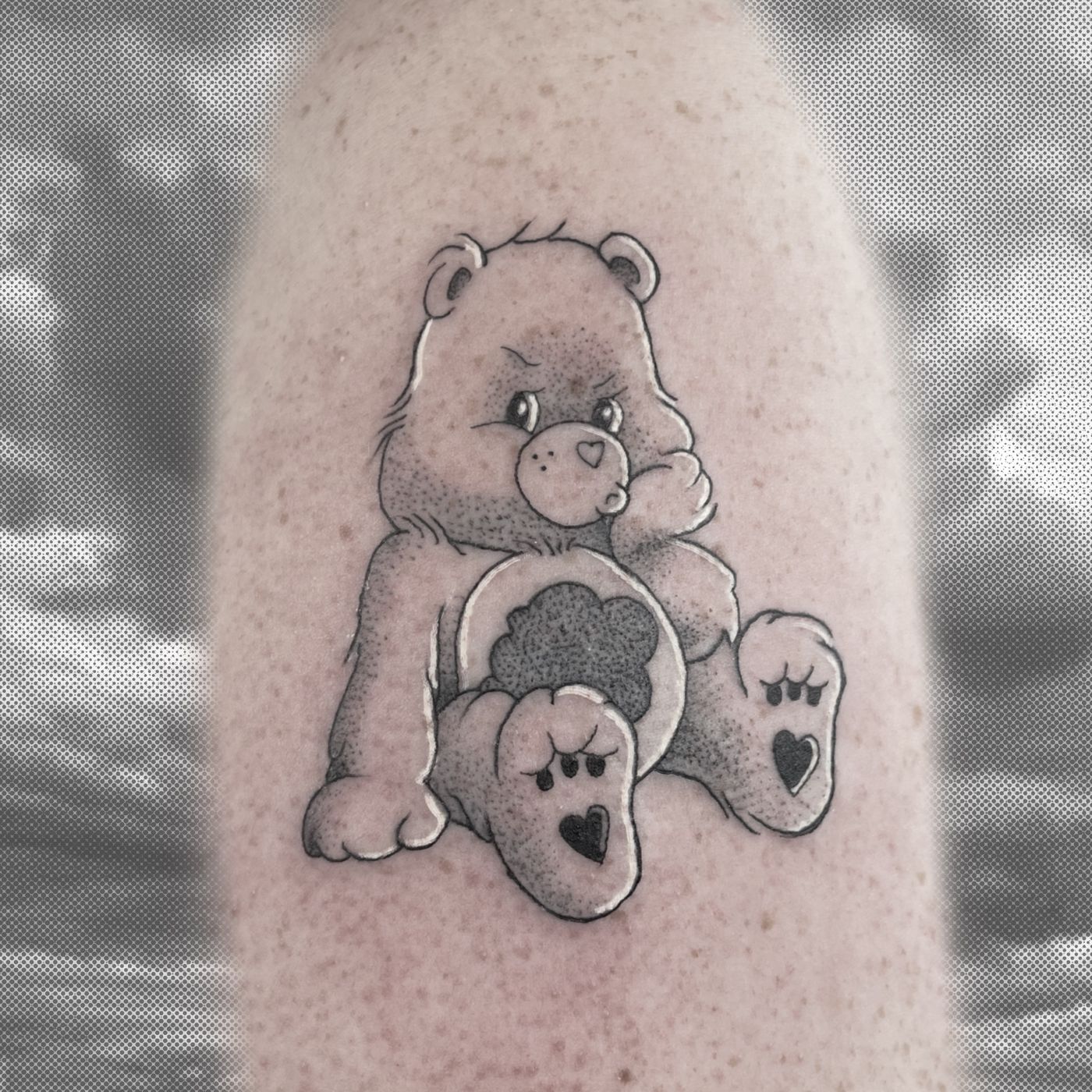 Unique dotwork and fine line illustrative tattoo featuring a bear and care bears, by Galen Bryce (aka Drip Skull).