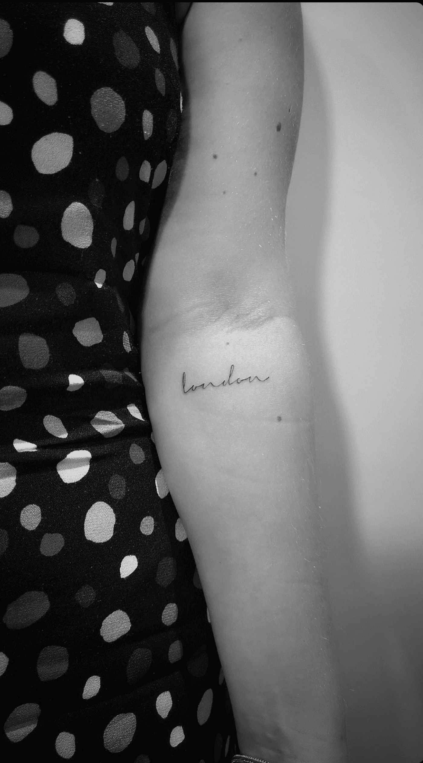 Capture the essence of London with this fine line cursive tattoo by Math. Perfect for those who love the city life.