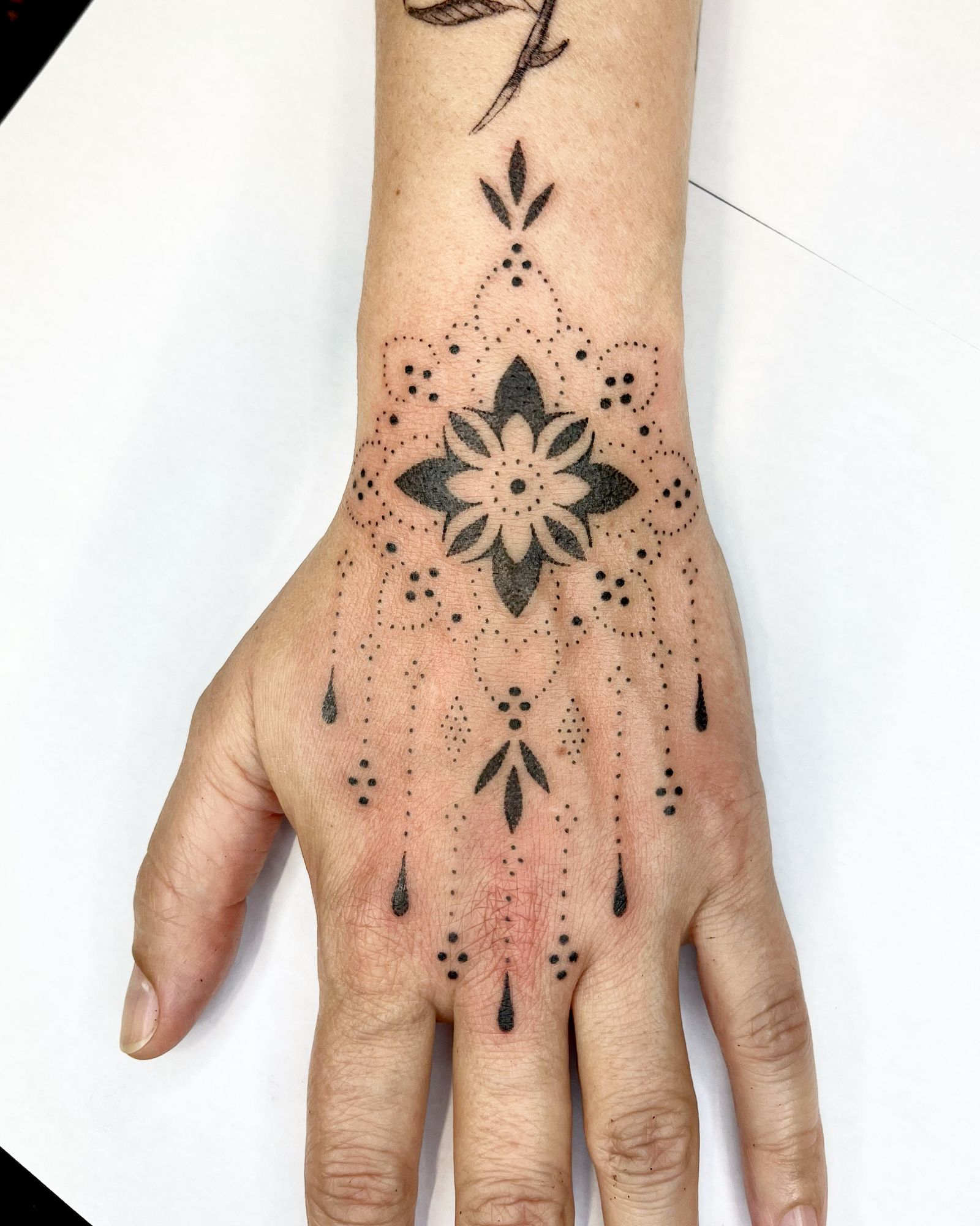 A delicate, symmetrical hand tattoo featuring a central black flower design with ornate dotwork and tear-drop-shaped elements that cascade downward. The technique appears to be fine-line dotwork, creating a refined, ornamental feel.