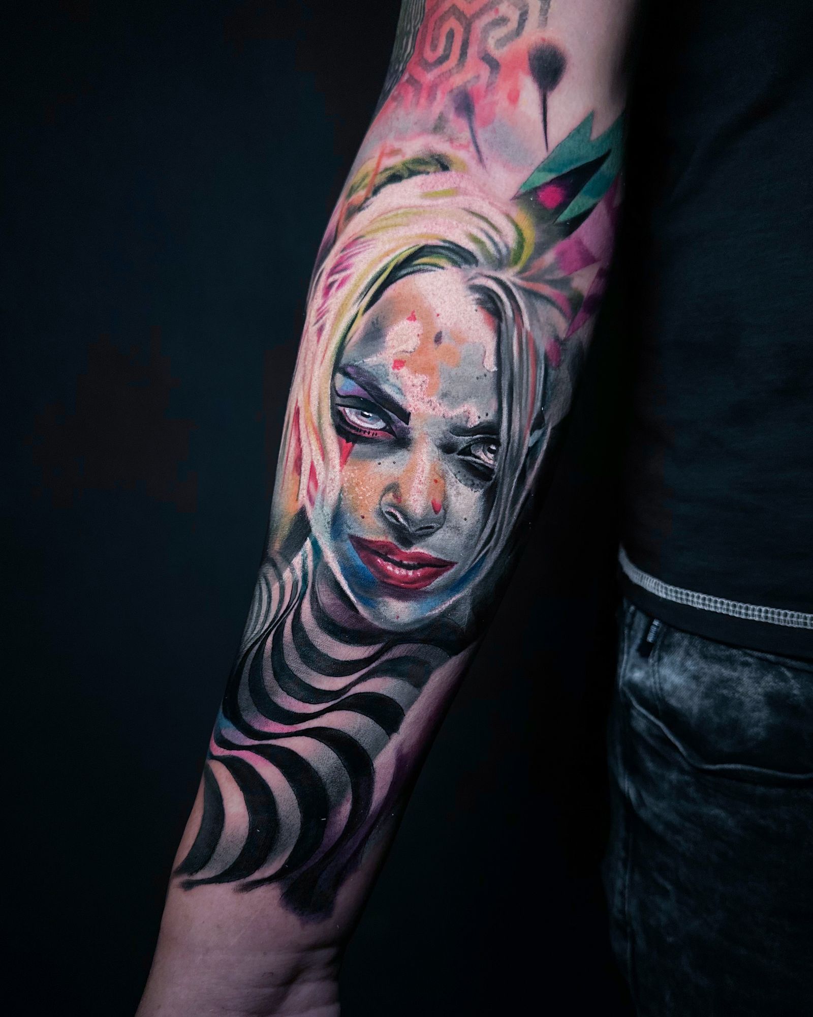 ❌Abstract Harley Quinn piece ❌ #harleyquinn #abstract #tatauz #warszawa #dc #comics #komiks #polska #mazowieckie #sureal #streetart #geometria #pattern #portret #twarz #kobieta #przedramie #colortattoo #surralism #abstract