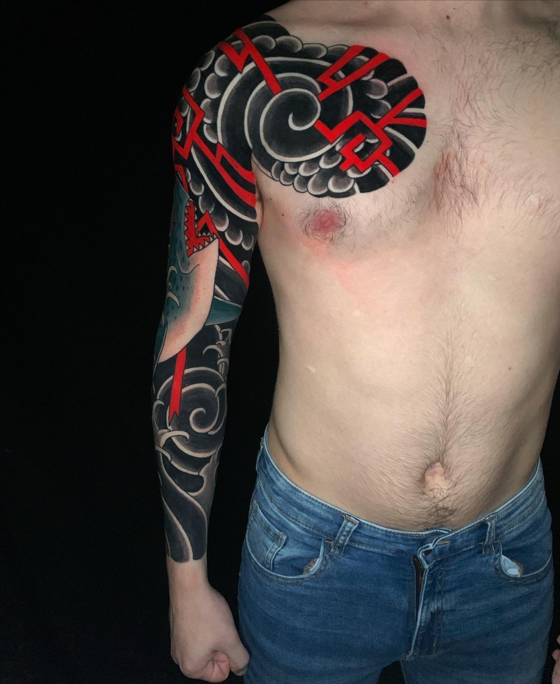 Experience the power of the ocean with this stunning Japanese tattoo featuring a fierce shark and intricate patterns. Created by the talented artist Andrea Furci.