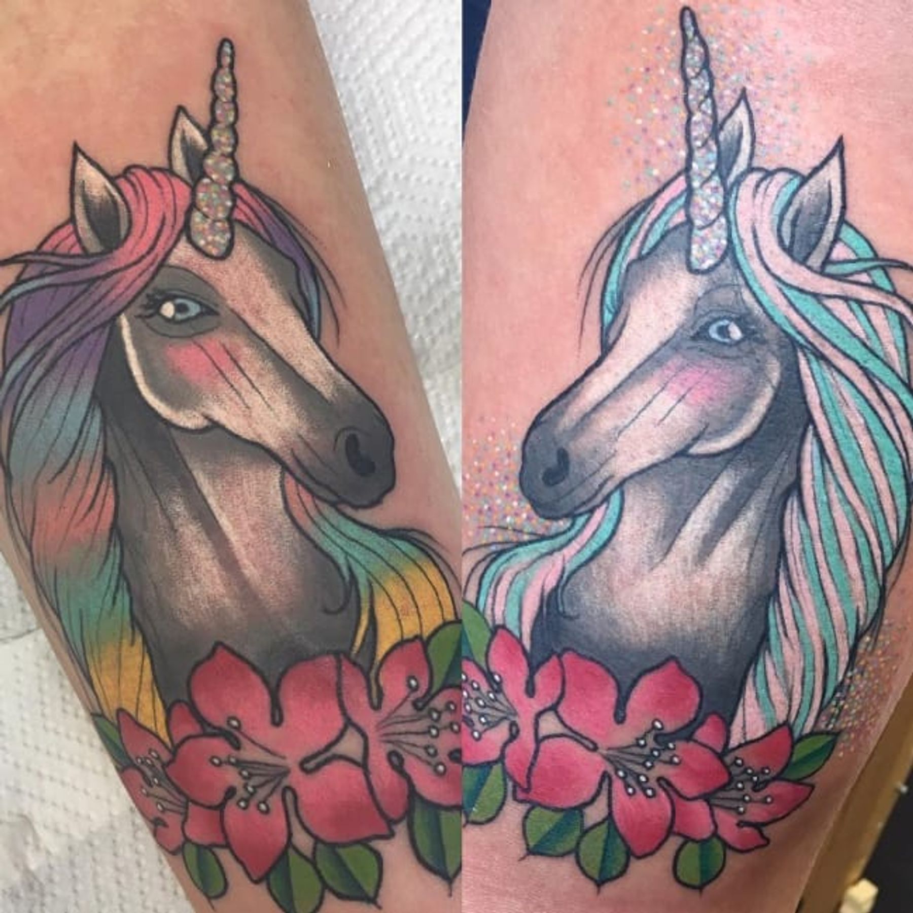 Matching unicorn tattoos by Stephanie Melbourne #StephanieMelbourne #neotraditional #colour #unicorn #matching