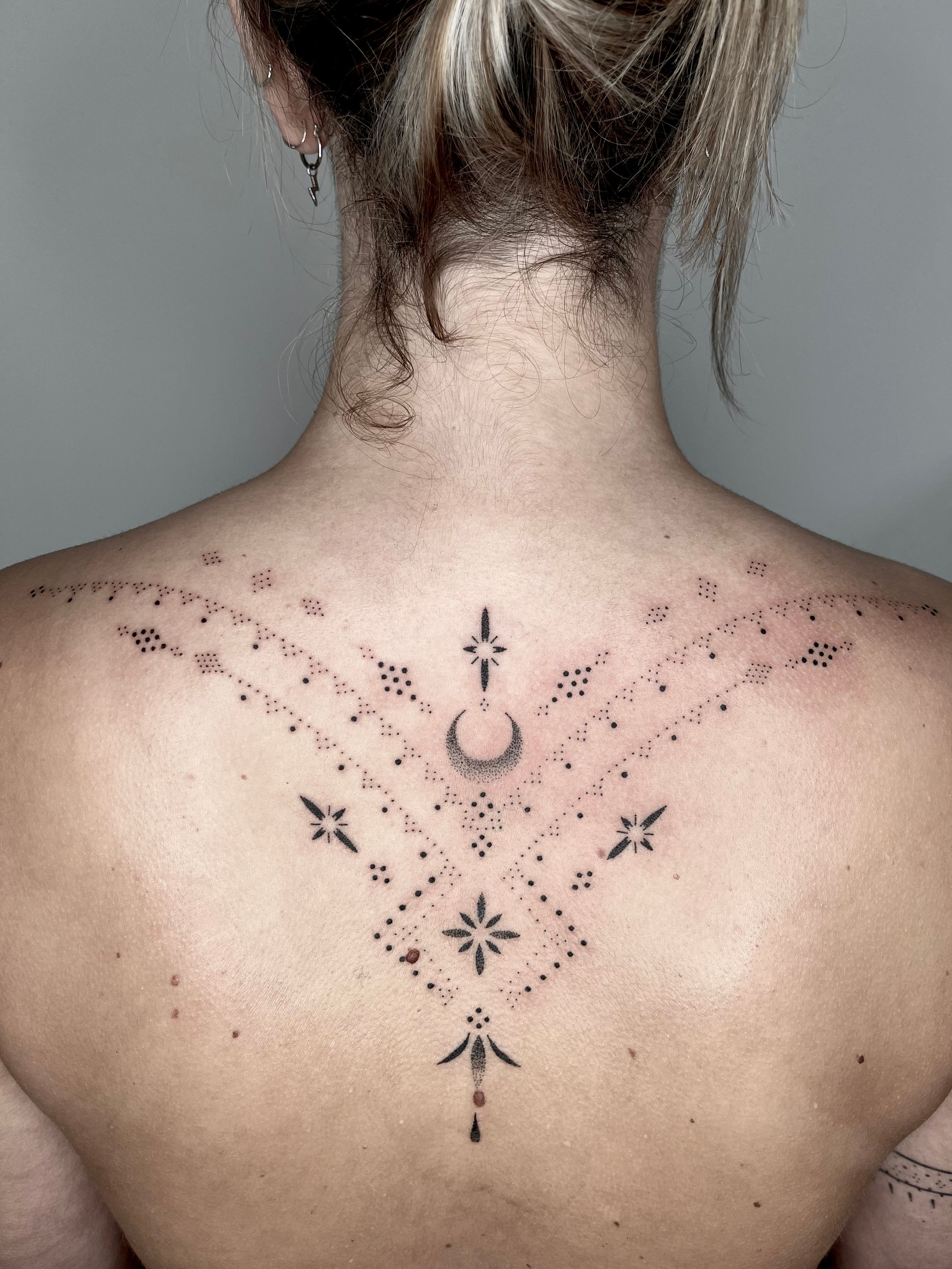 The back tattoo has a symmetrical design featuring geometric shapes, a crescent moon, and star-like elements. The style is elegant and detailed. It uses dotwork with tiny dots creating the design, and the tattoo has a delicate feel.