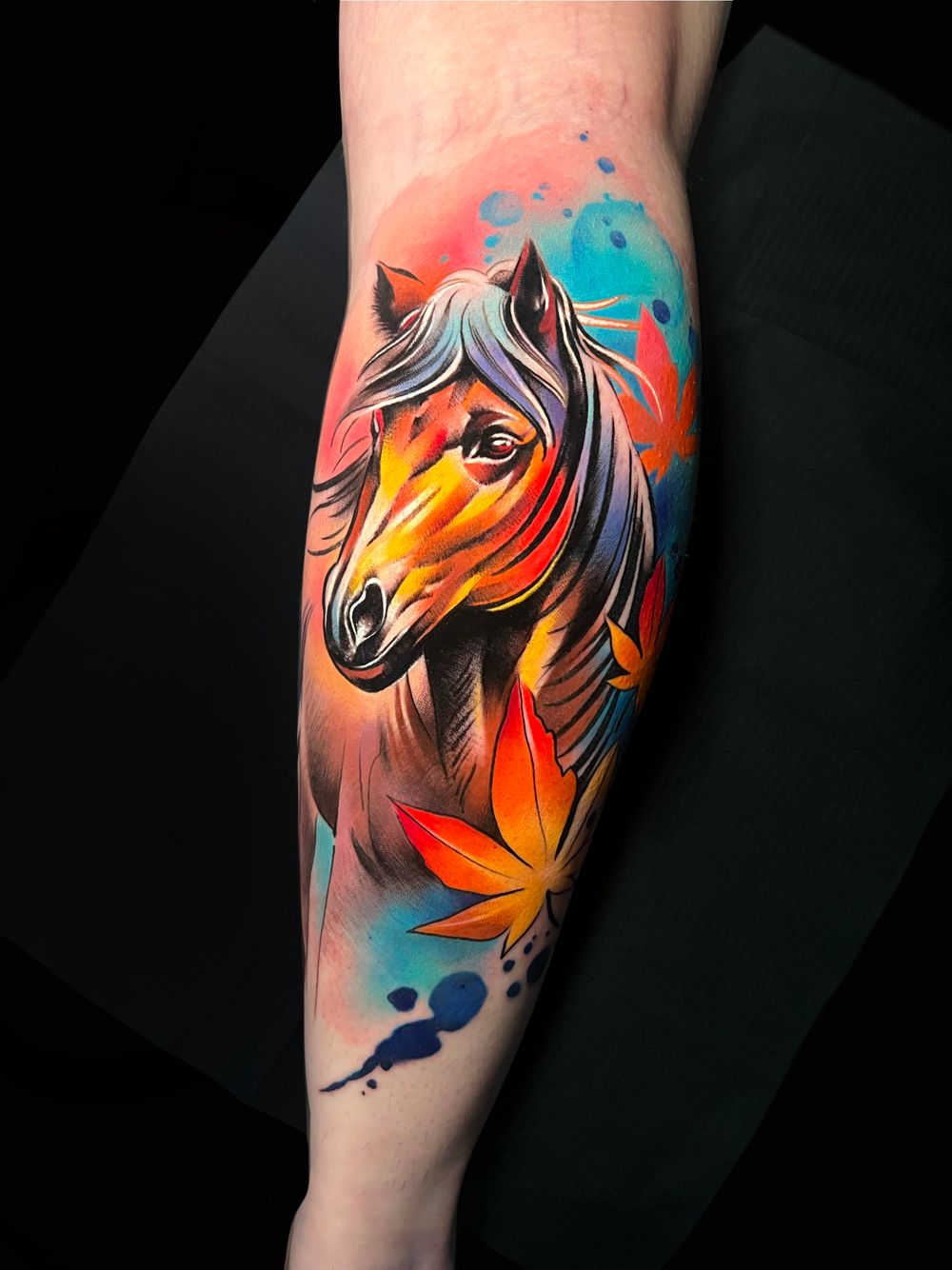 Express your free spirit with a stunning watercolor horse tattoo on your lower arm, by the talented artist Cloto.tattoos.