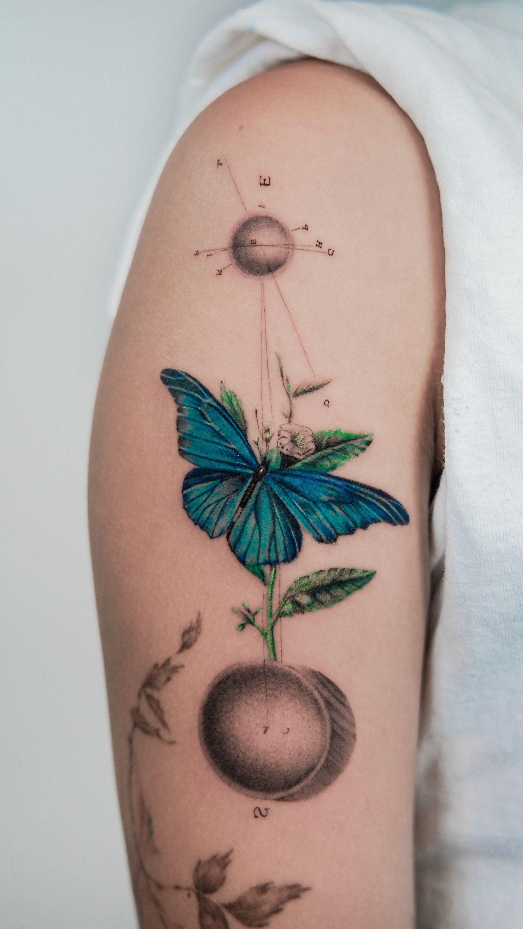 Beautiful upper arm butterfly tattoo by Jacky Yang, combining micro-realism and watercolor styles for a stunning and unique design.
