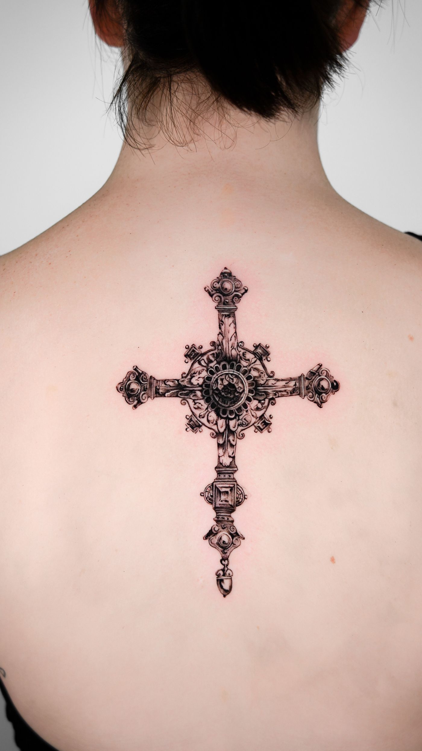 Get a stunning black and gray realism tattoo of a processional cross on your upper back by the talented artist Jacky Yang.