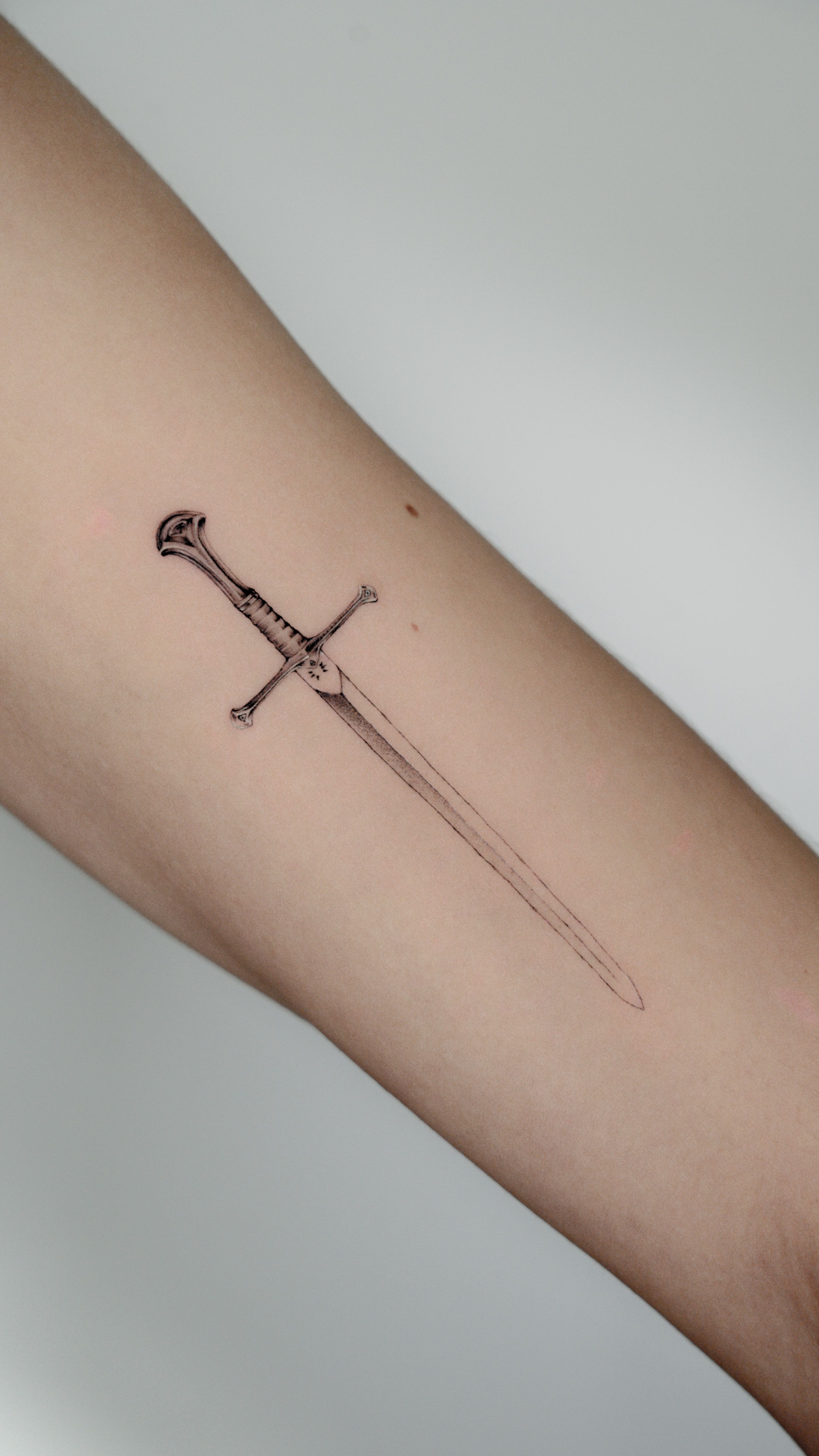 Elegant fine line sword tattoo on upper arm, expertly done by tattoo artist Jacky Yang. Embrace your inner warrior with this stylish design.