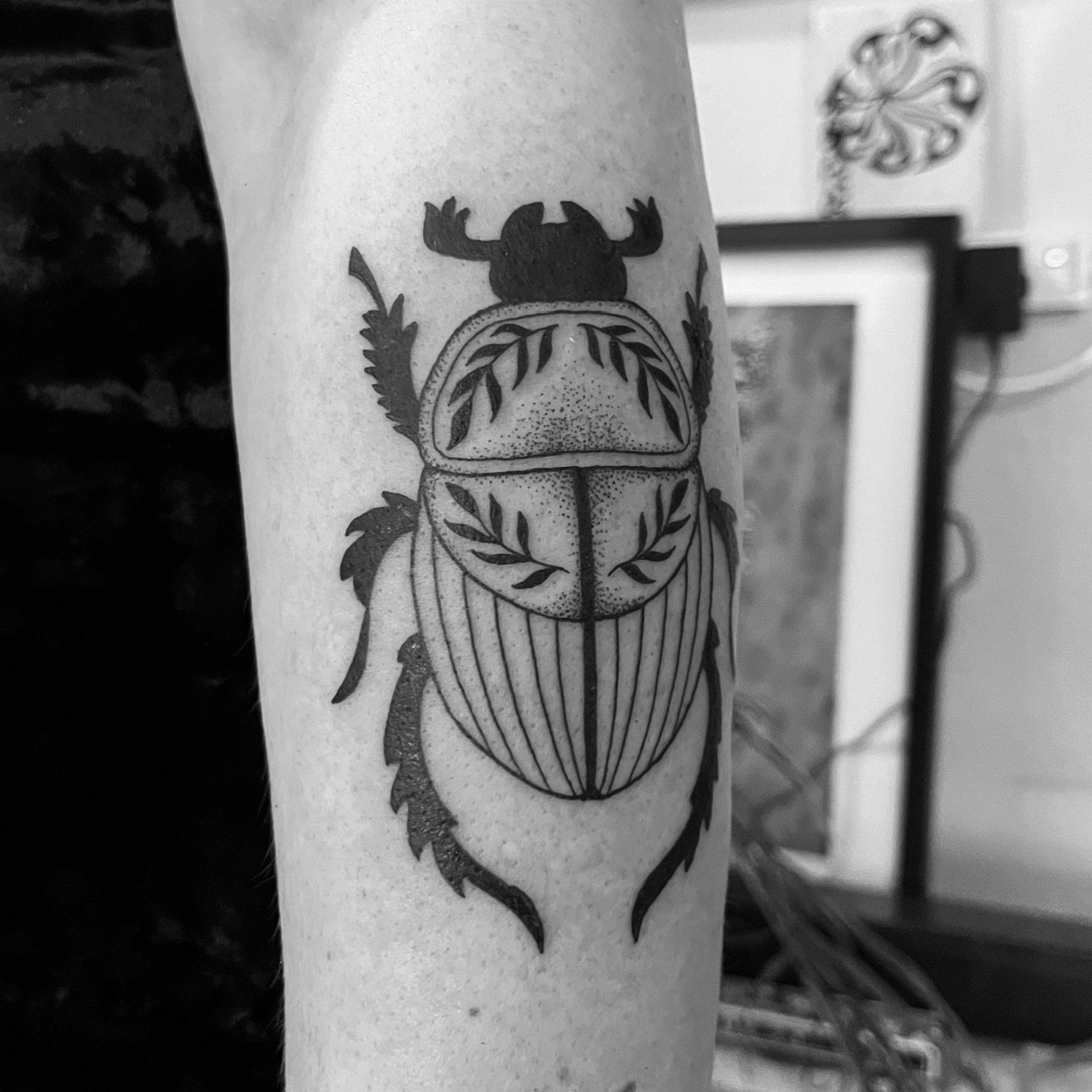 Unique dotwork design of a scarab beetle by Claudia Vicente, combining illustrative style with precision.