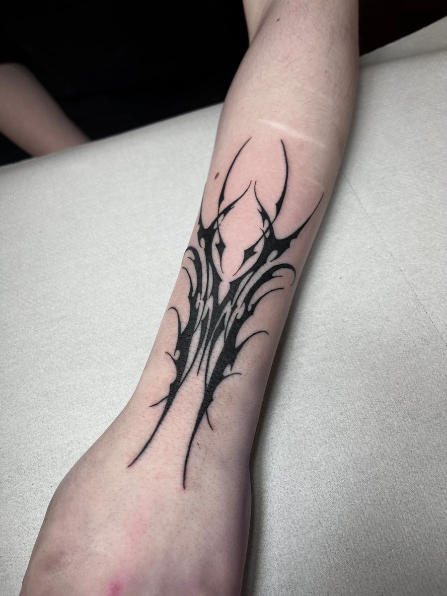 A black tribal design is tattooed on the forearm. It's composed of jagged, elongated shapes, creating a dynamic, abstract pattern. The style is bold, with a focus on sharp lines and graphic impact.