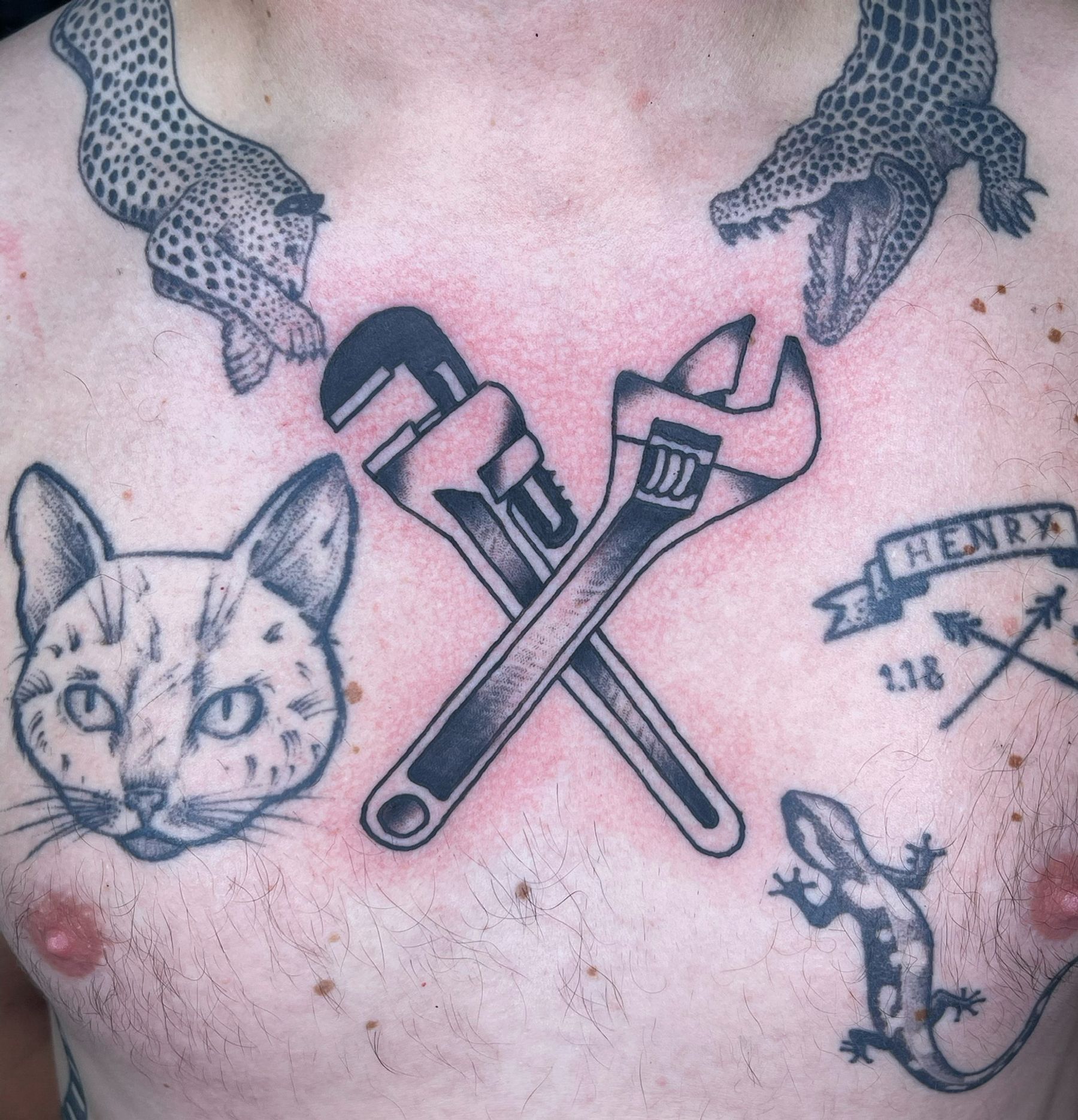The tattoo features two crossed wrenches in a traditional style. There are also various other smaller tattoos including a cat, a crocodile, and a lizard.