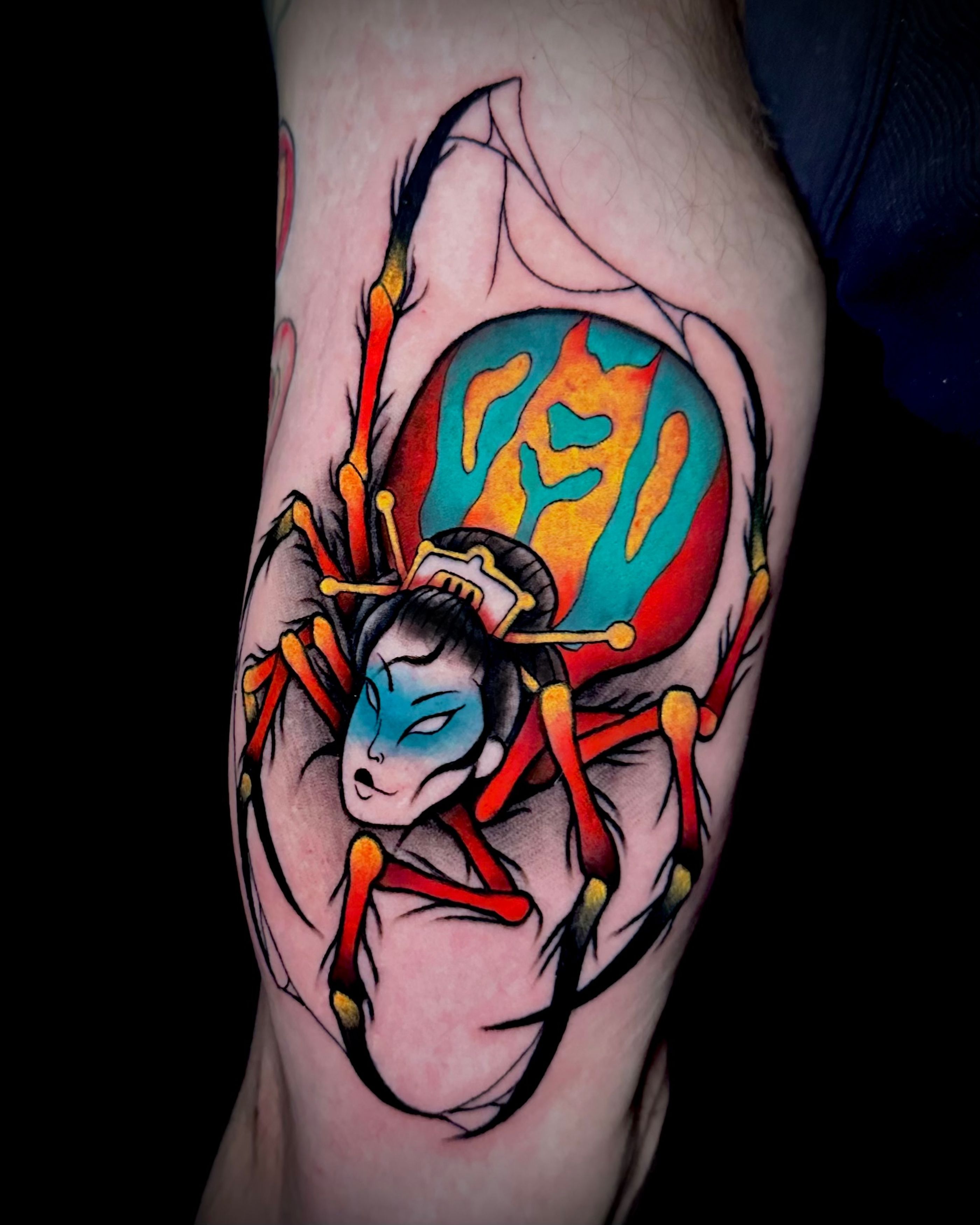 Jorōgumo is a Yōkai. A creature of Japanese folklore. It can shapeshift into a beautiful woman. It lures unsuspecting victims in with her looks and then devours them. Fun right. Tattoo by Nikki Swindle #NikkiSwindle #tattoodo #tattoodoapp #tattoodoappartists #besttattoos #awesometattoos #tattoosforgirls #tattoosformen #cooltattoos #neotraditional #neotradtattoo #Jorogumo #yokai #japanesetattoo
