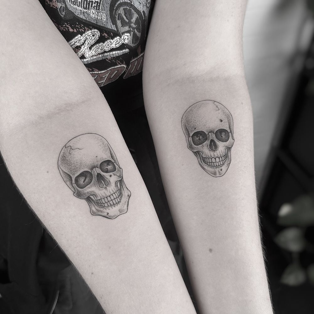 Experience a unique blend of dotwork and illustrative style in this striking skull tattoo, expertly created by tattoo artist Oliver Whiting.