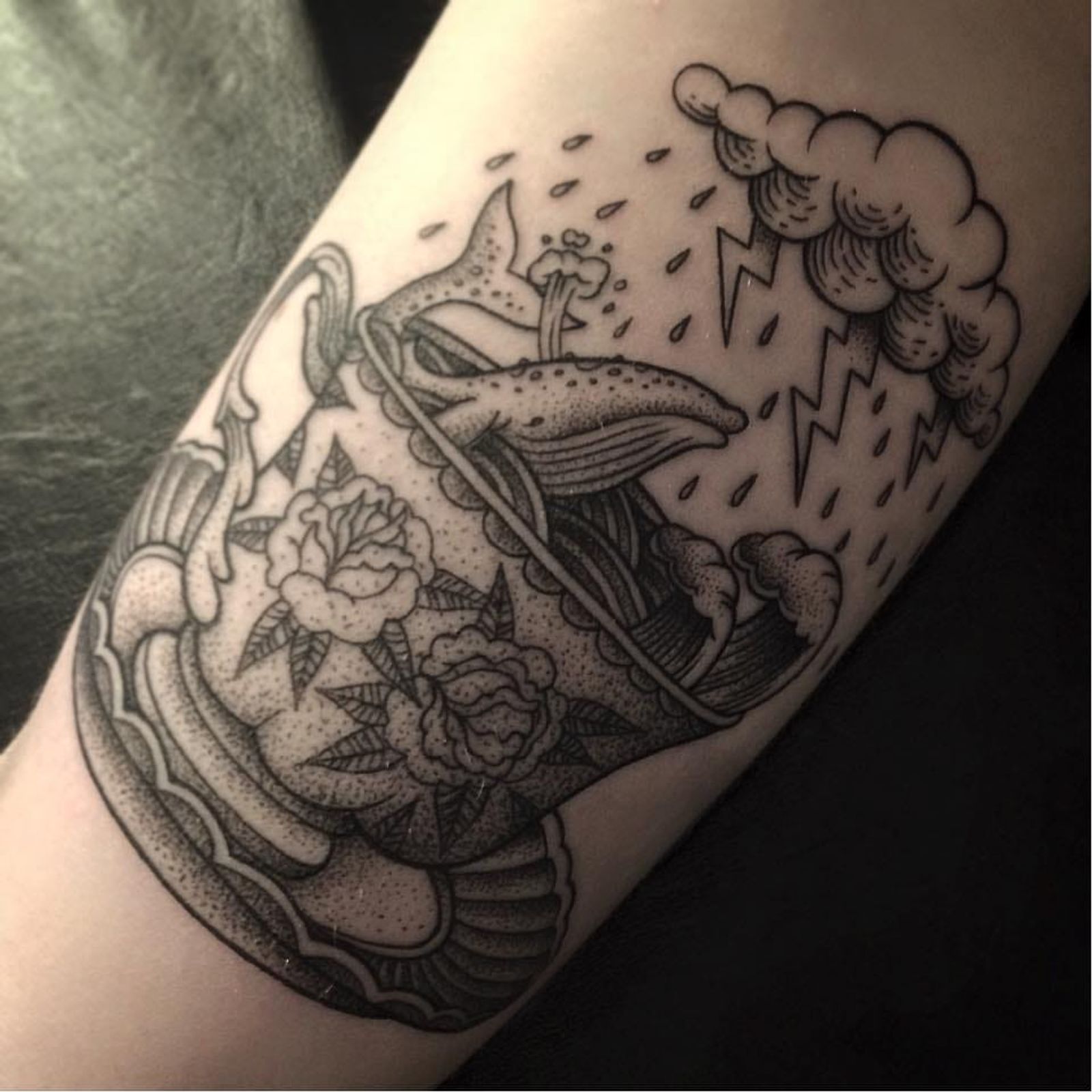 Poetic tea cup tattoo by Toma Pegaz #TomaPegaz #blackwork #teacup #storm #whale #thunder #lightning #waves