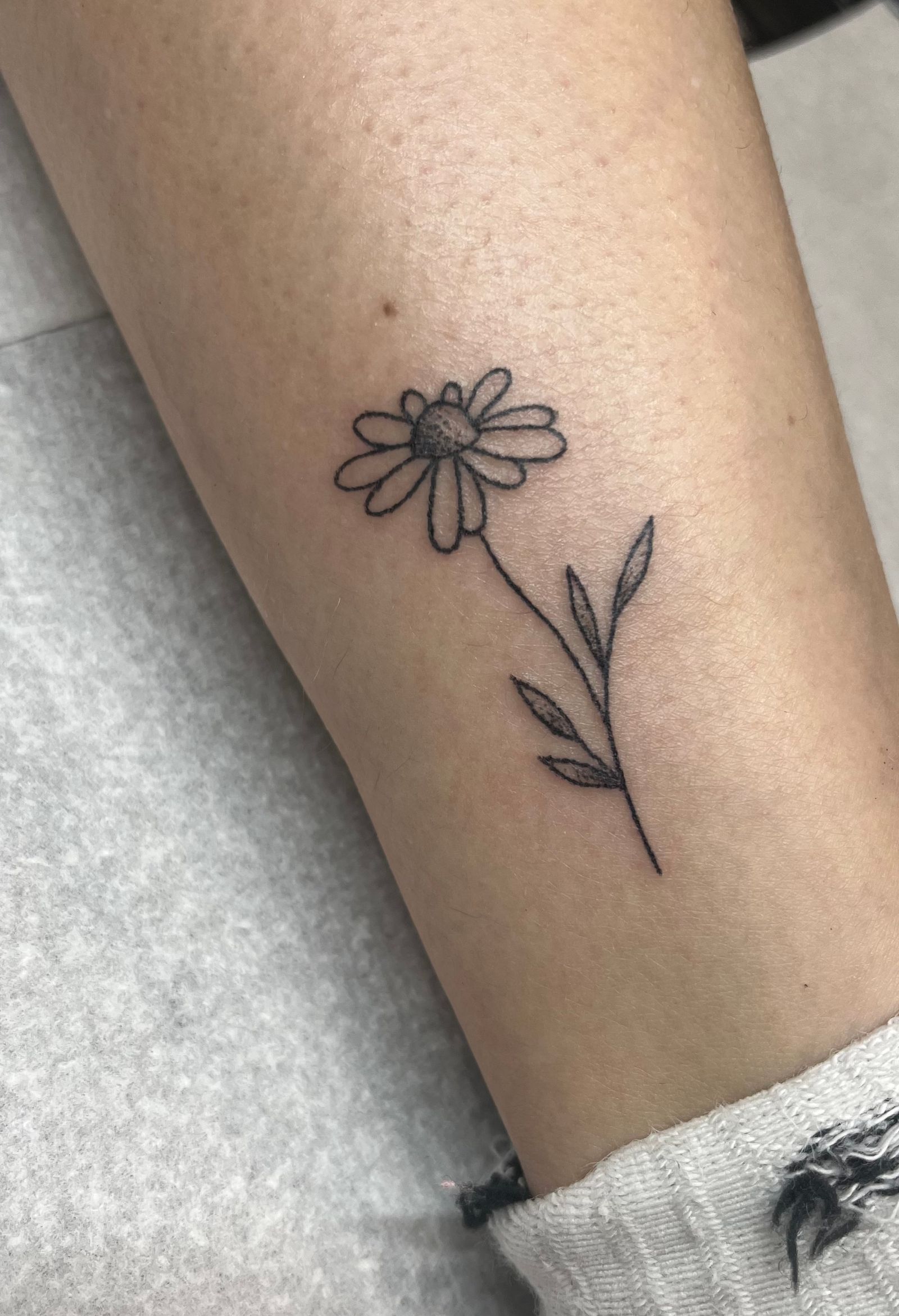 Experience the beauty of hand-poked dotwork with this exquisite daisy tattoo by Marketa. A timeless symbol of purity and innocence.