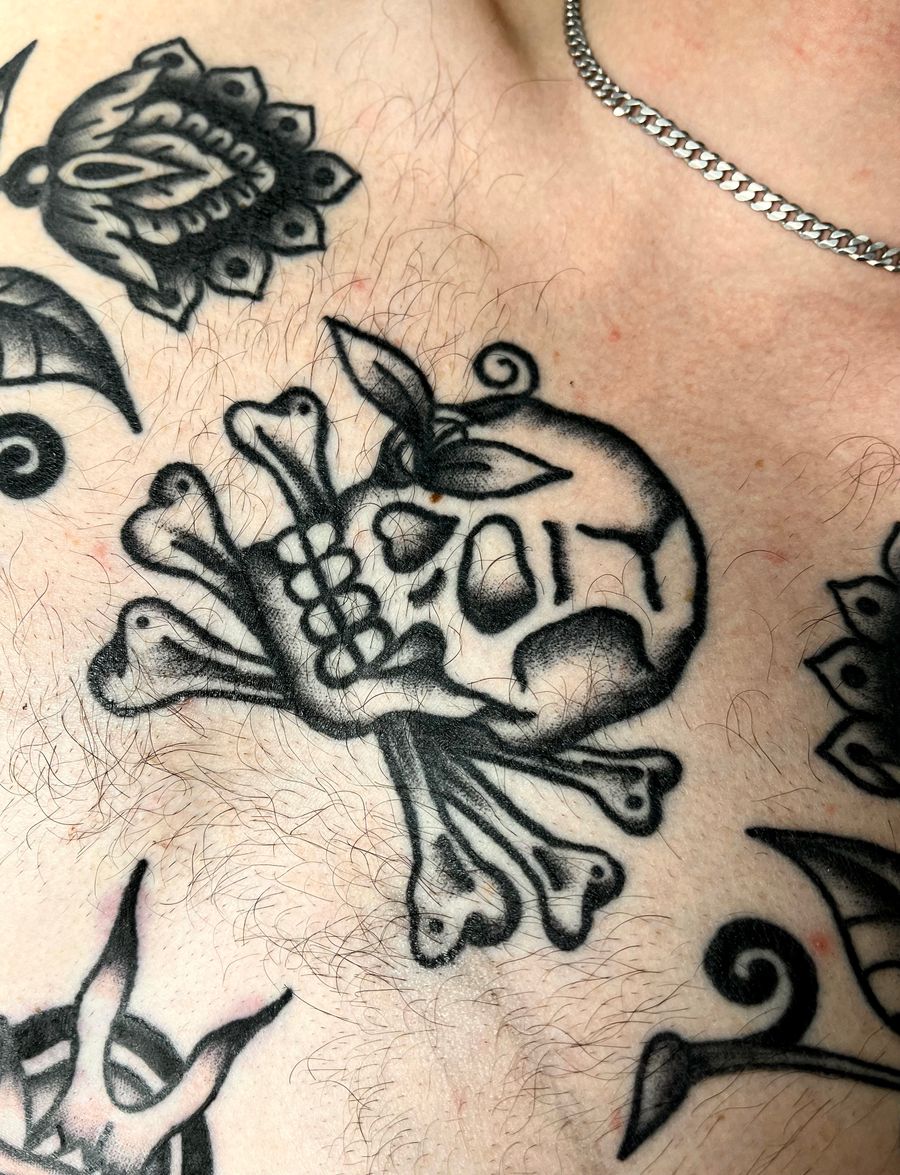 Classic traditional skull tattoo design created by the talented artist Clara Colibri, showcasing intricate details and bold lines.