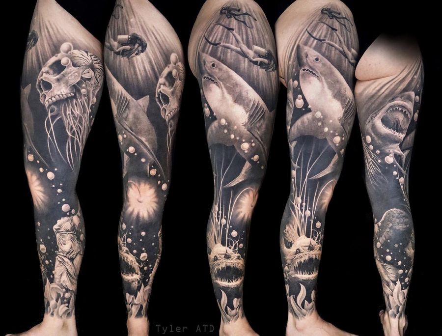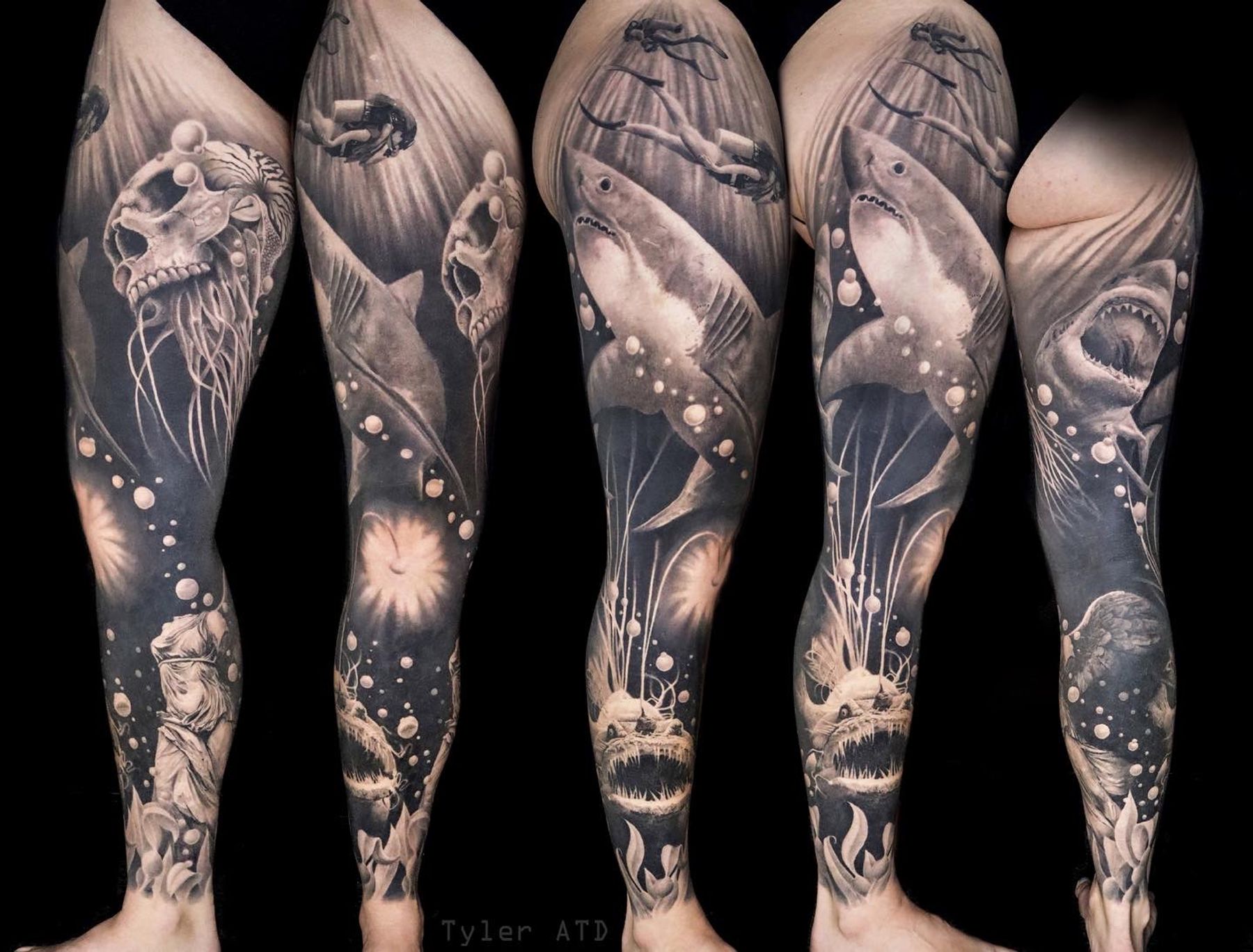 Sea legs. Underwater theme leg sleeve tattoo. Realistic black and grey. Angler fish, sharks, statue, nautilus, scuba diver. Tattoo