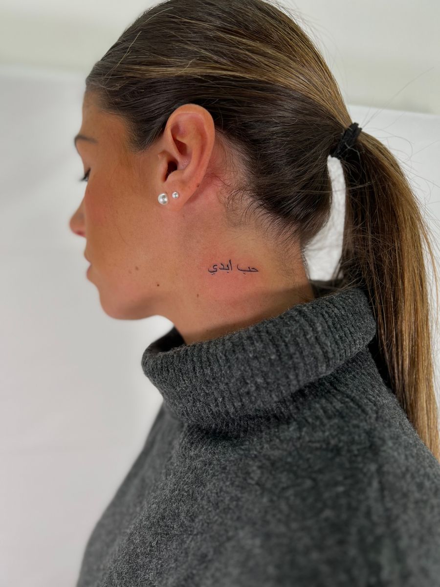 The tattoo depicts Arabic script, placed on the back of the neck.