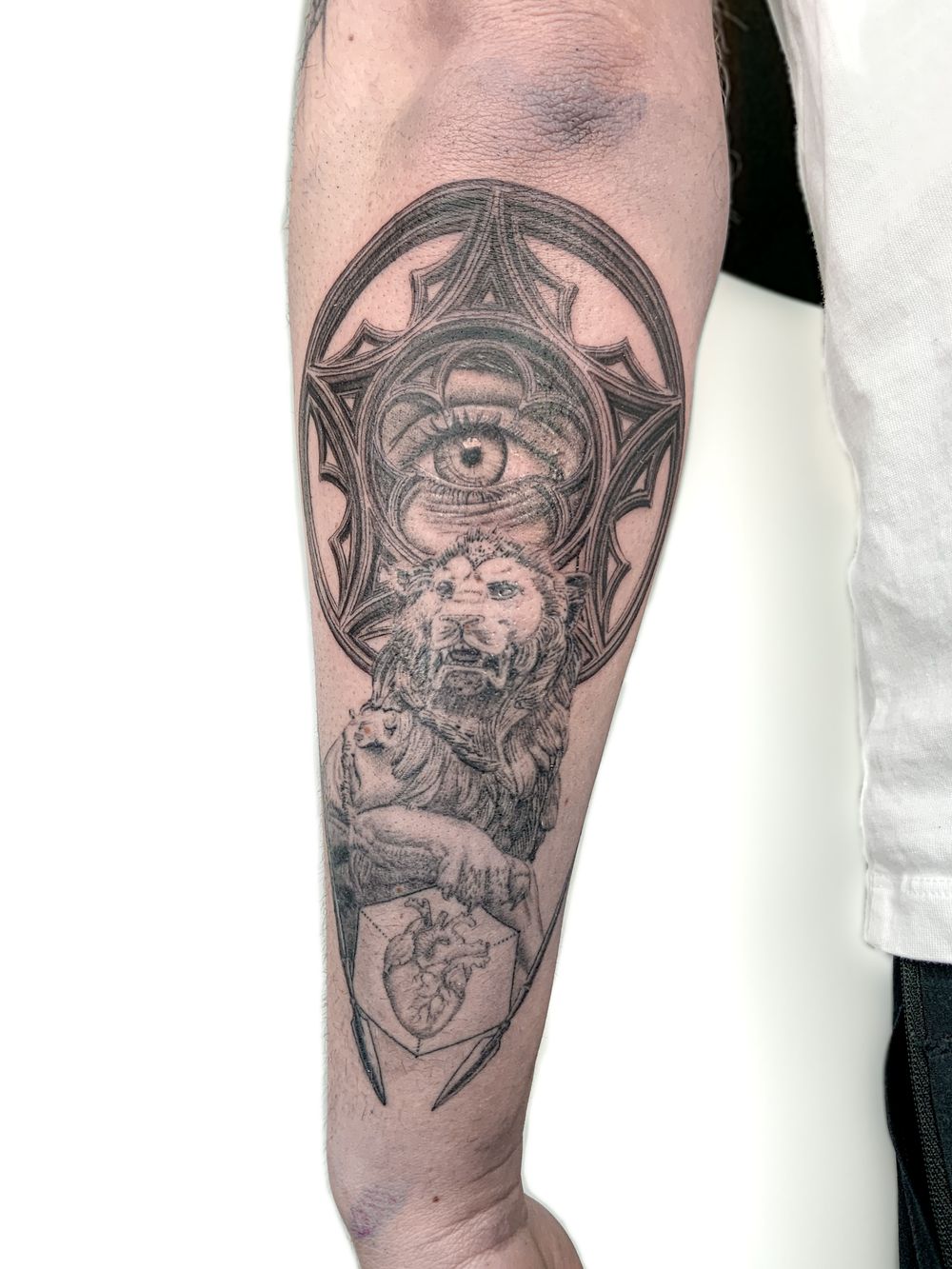 Black and grey realism of lion statue holding heart with cathedral window in the background with a realistic eye looking through.