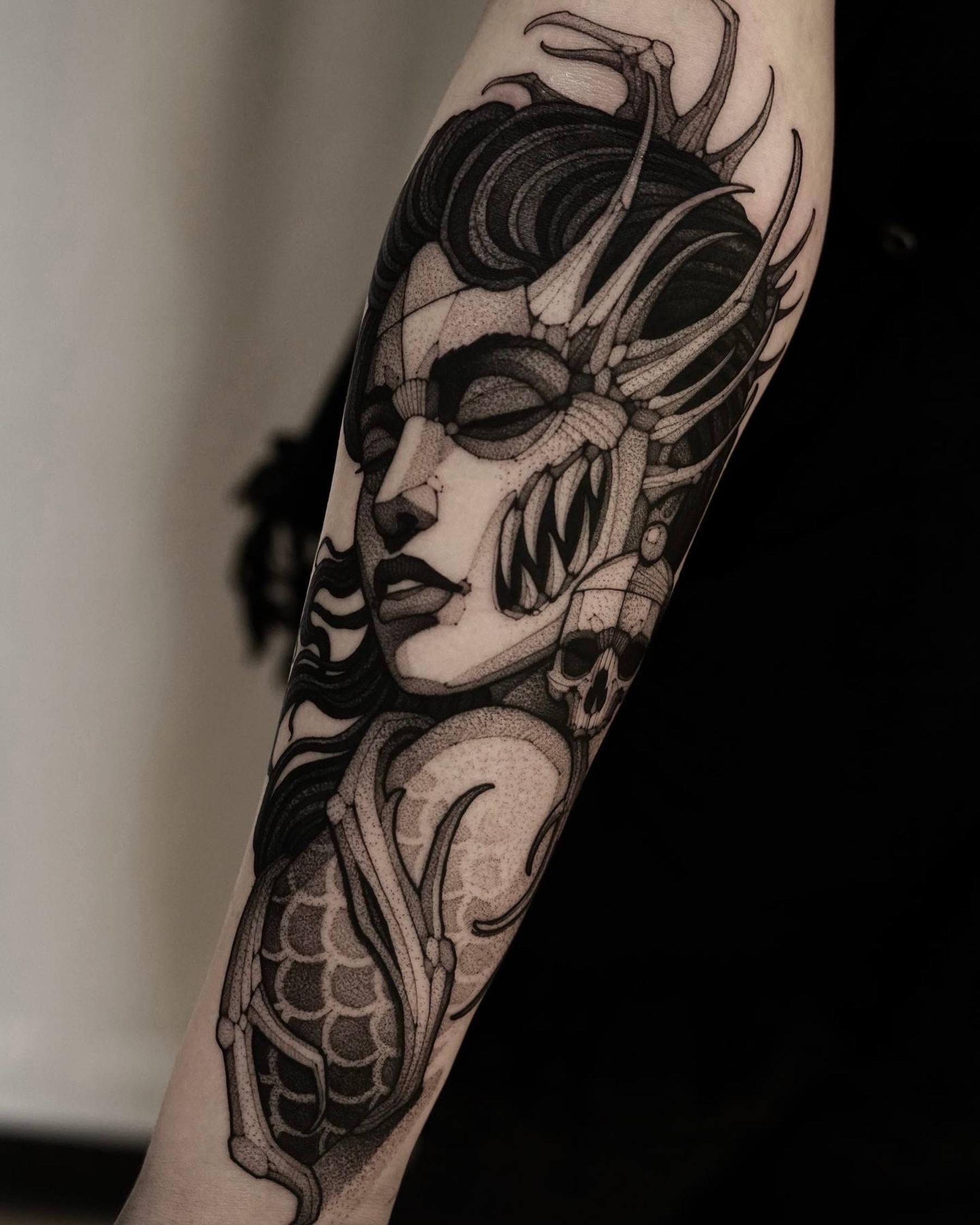 eldritch goddess #ladyface #skull #blackwork #portrait #occulttattoo #dotwork #eldritchtattoo