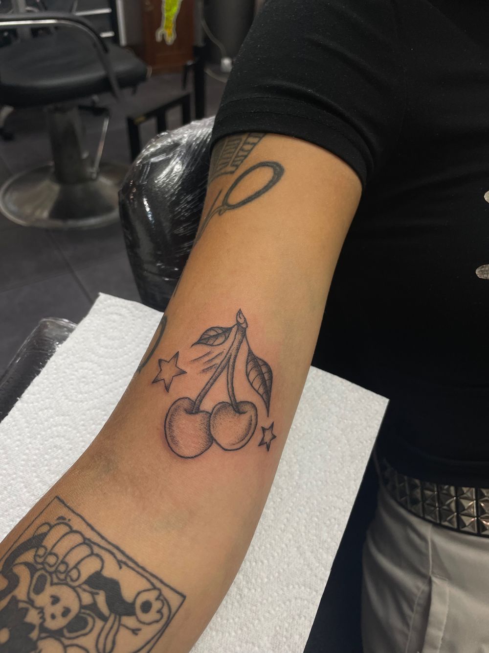 The tattoo features a pair of cherries with stems and leaves, accompanied by a few stars. It appears to be a traditional style tattoo, with bold outlines and simple shading. The technique involves solid black lines and minimal detail. The overall feel is cute and straightforward.