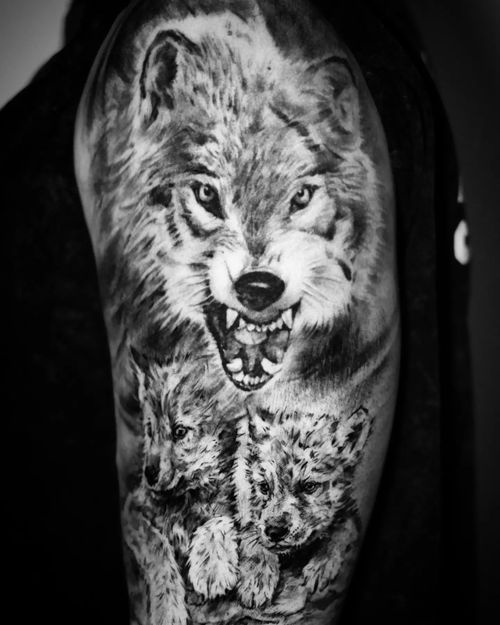 a wolf accompanied by two adorable baby wolves tattoo