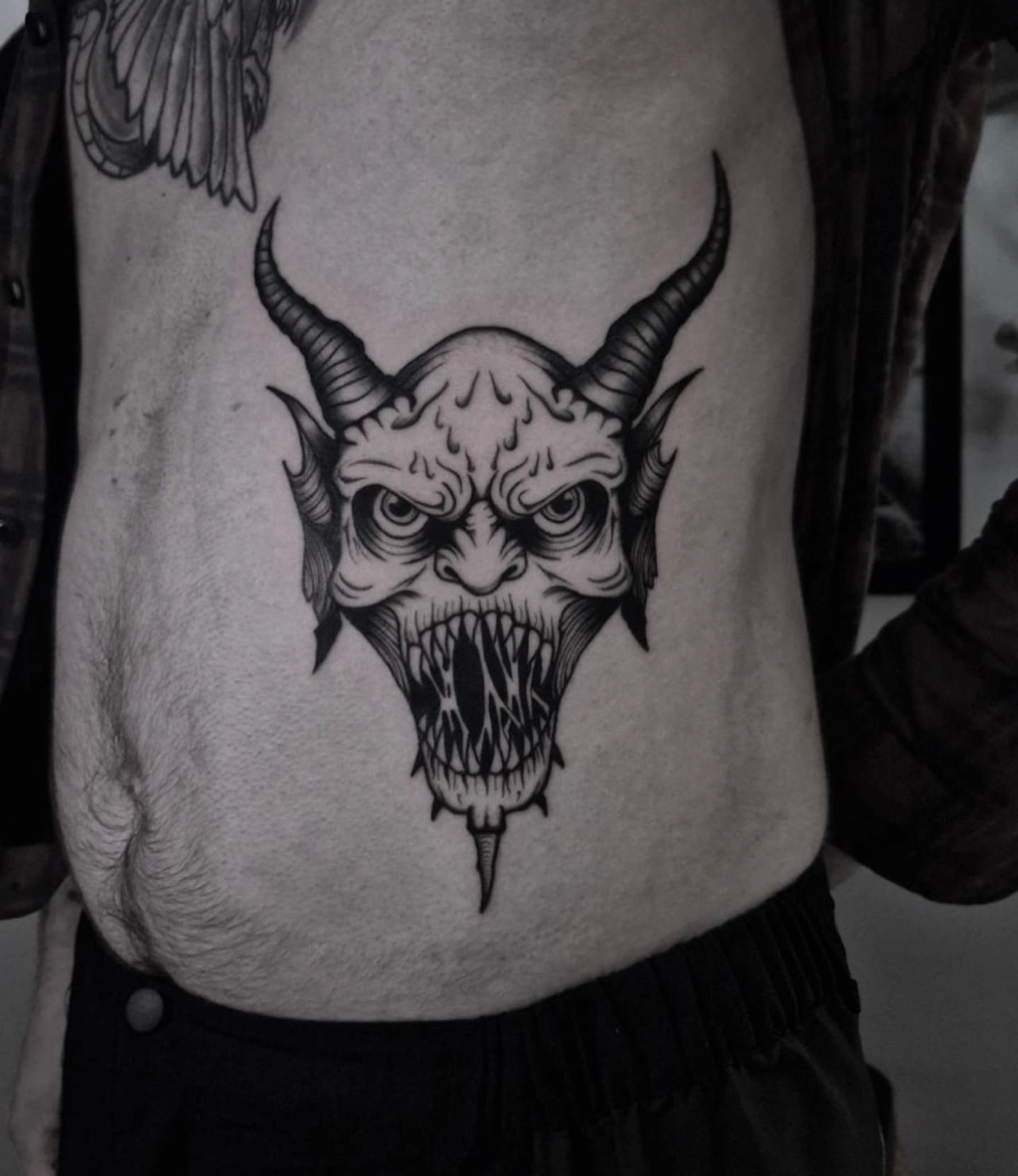 The tattoo presents the face of a demon. The demon has sharp horns, fierce eyes, and bared fangs. The design is executed with clean lines and sharp details, creating a powerful and intimidating effect.