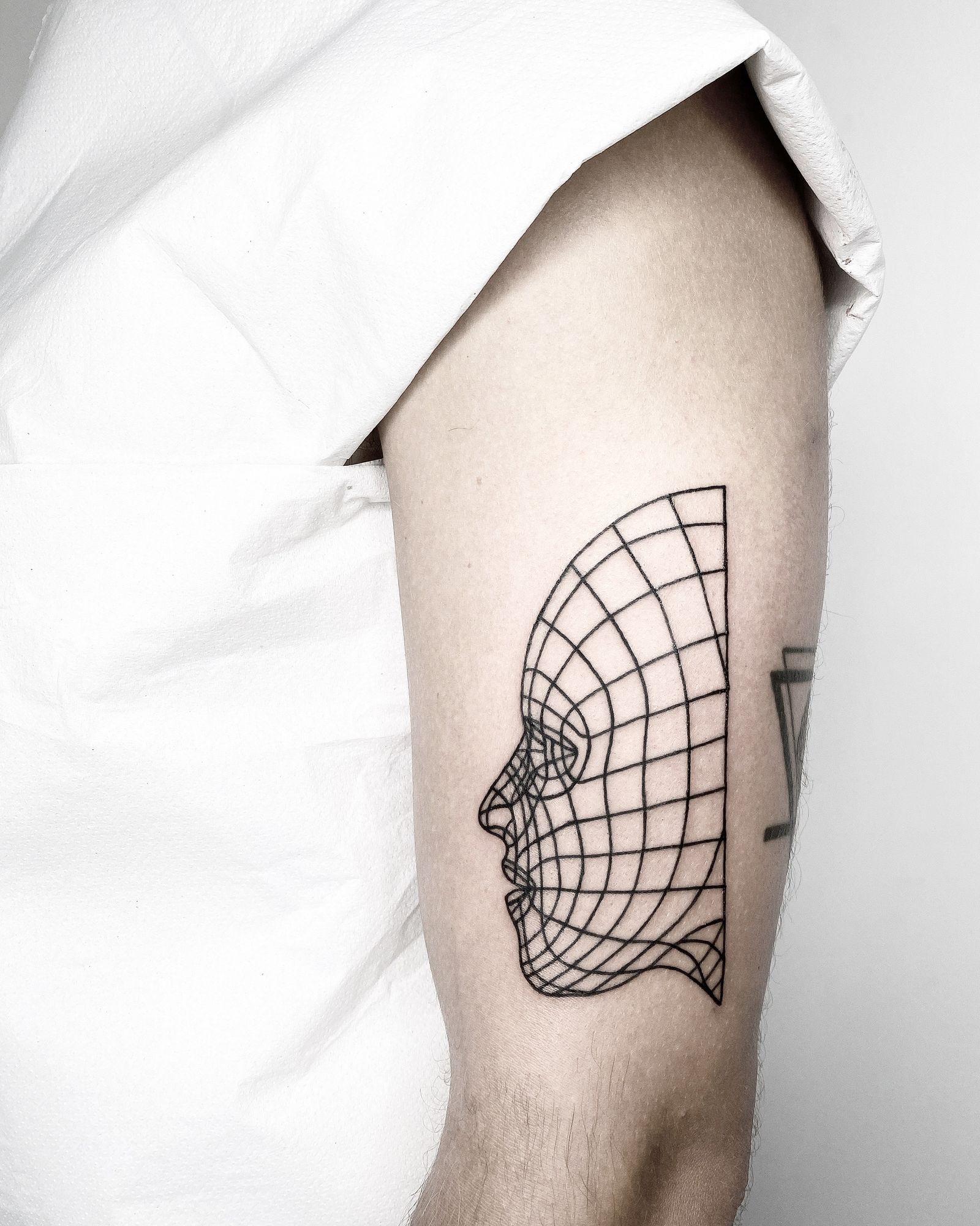 Fine line tattoo by Malvina Maria Wisniewska featuring a striking geometric wireframe design of a face.